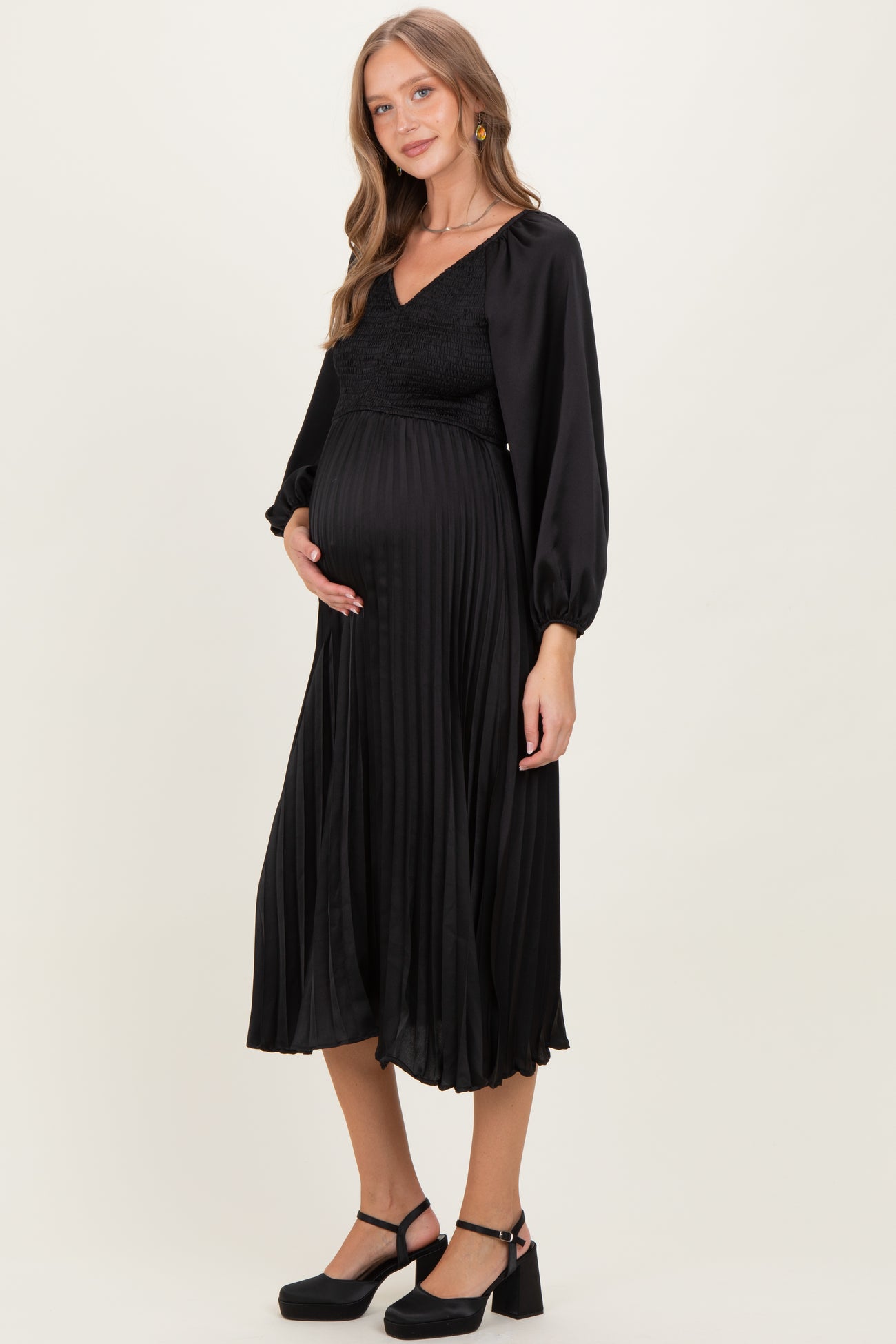 Elevate your maternity wardrobe with this satin smocked pleated midi dress, designed for both comfort and style throughout your pregnancy. The smocked bodice offers a flexible fit that adapts beautifully to your growing bump, while the flowing pleated skirt creates an effortlessly elegant silhouette. Featuring long, voluminous sleeves with gathered cuffs, this dress adds a touch of sophistication perfect for special occasions or everyday wear. The V-neckline enhances femininity and pairs beautifully with your favorite accessories. Crafted from soft, breathable fabric, it ensures all-day comfort without compromising on chic. Embrace your maternity glow in this timeless piece made to flatter every stage.