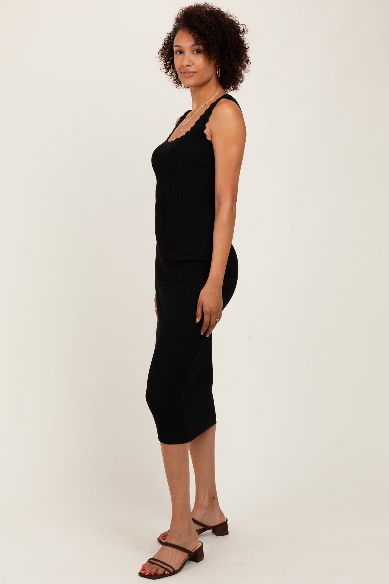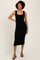Black Scallop Trim Ribbed Knit Sleeveless Midi Dress