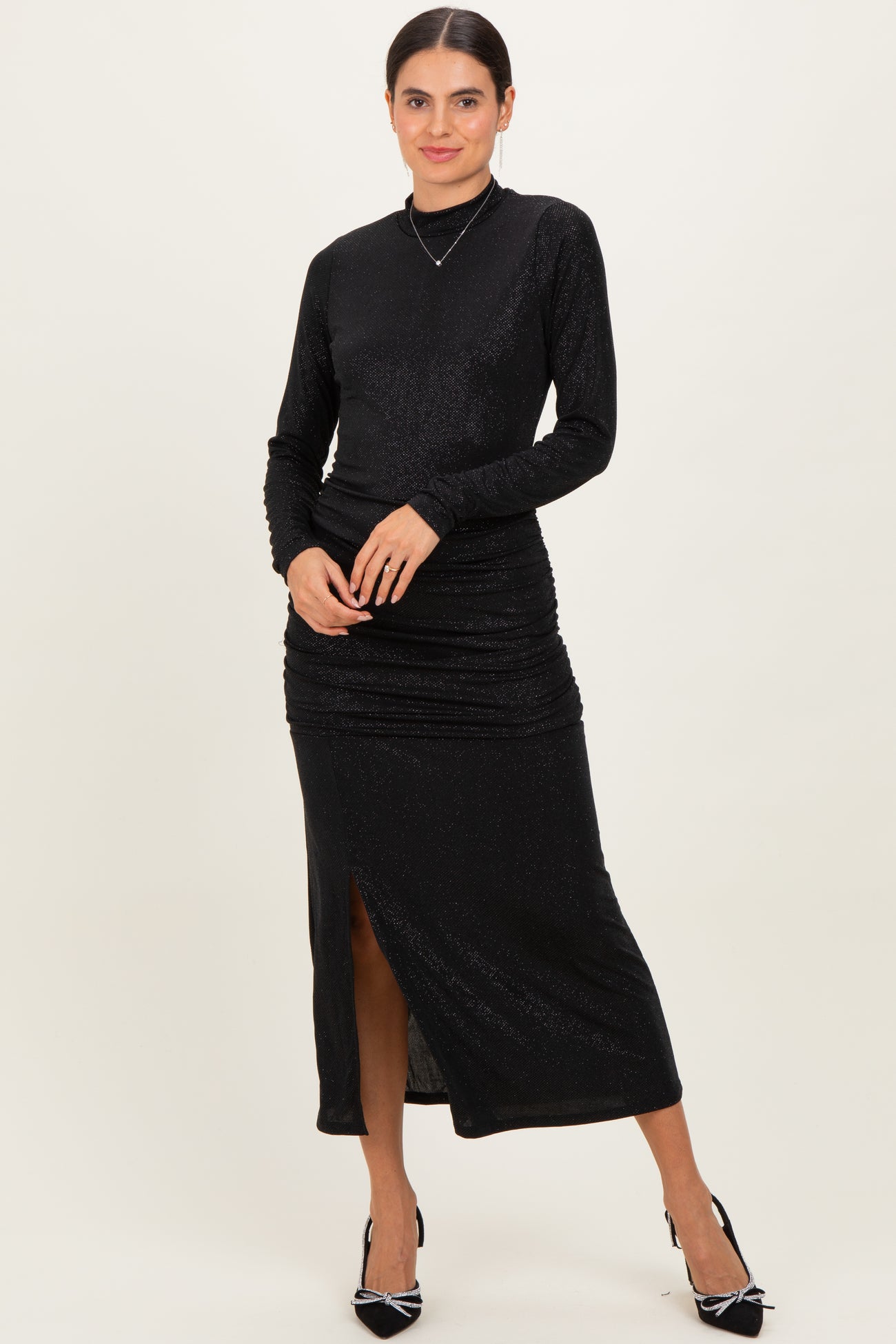 Elevate your maternity wardrobe with this stunning Sequin Long Sleeve Mock Neck Maxi Dress, designed to embrace and flatter your growing bump. Crafted from a stretchy, shimmering fabric, it offers both comfort and a touch of glamour for special occasions. The mock neck adds a chic, sophisticated detail, while the ruched sides ensure a perfect fit throughout pregnancy, enhancing your natural silhouette. The long sleeves provide warmth and elegance, making it ideal for evening events or holiday celebrations. Pair with your favorite heels for a dazzling maternity look that shines from bump to baby.