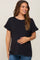 A solid hued maternity top featuring short sleeves and a rounded neckline.