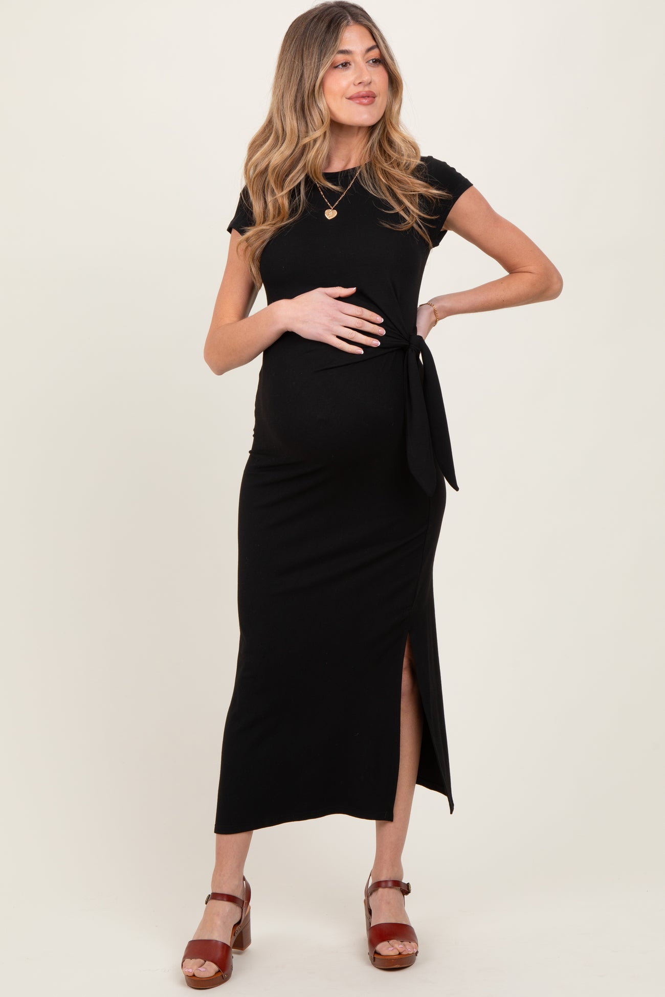 Elevate your maternity wardrobe with this Black Side Knot Tie Short Sleeve Maternity Midi Dress. Crafted from a soft, stretchy fabric, it comfortably hugs your growing bump while providing a flattering silhouette. The elegant side knot detail adds a stylish touch and allows for adjustable fit as your belly grows. Featuring short sleeves and a chic midi length with a front slit, this dress is perfect for casual outings or dressier occasions. Pair with your favorite sandals or heels for an effortlessly sophisticated look throughout your pregnancy. Embrace comfort and style in one stunning piece!
