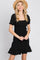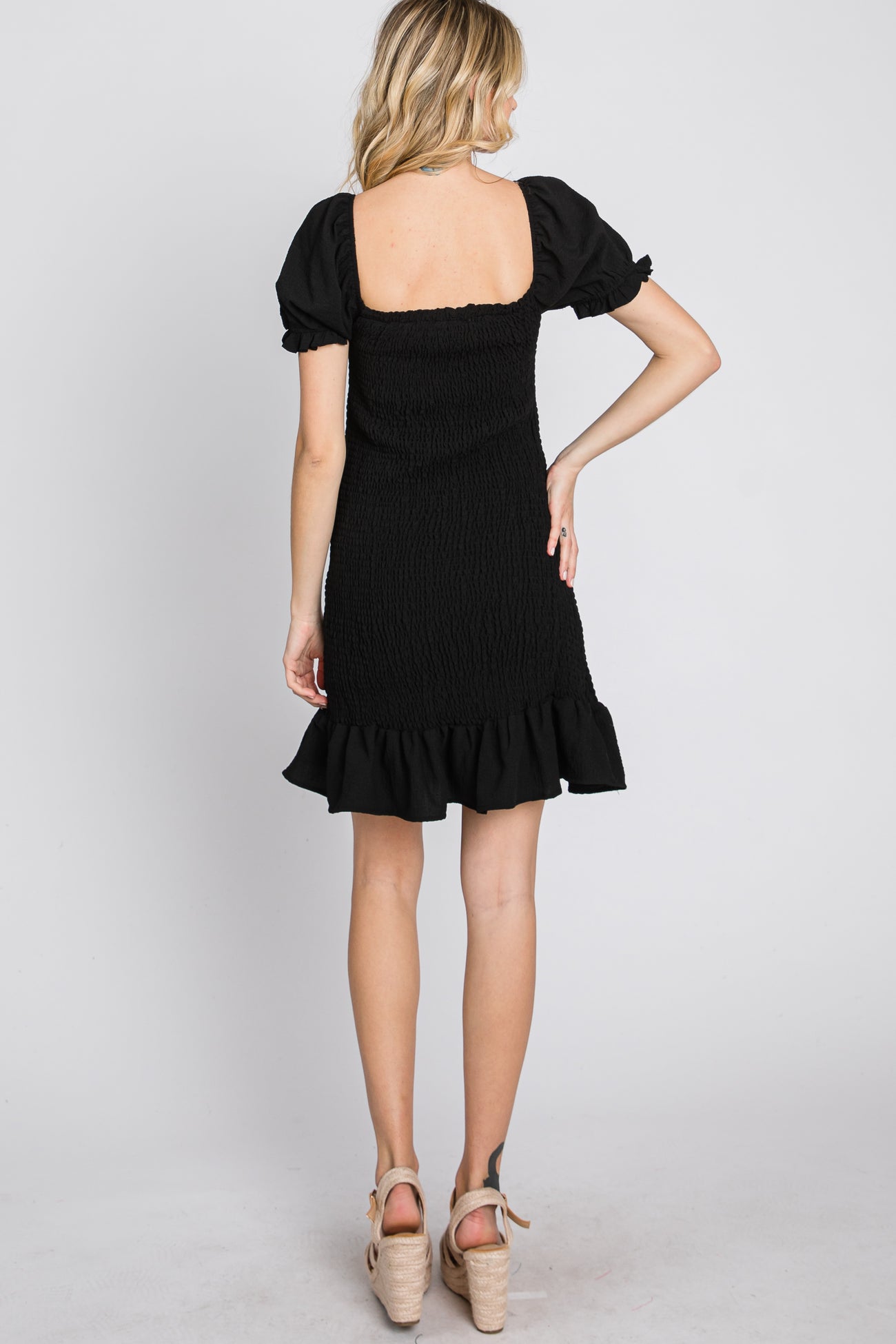 Details A solid hue mini dress featuring short puff sleeves, a smocked body, a squared neckline, and a bottom rubble hem. Body is lined to prevent sheerness. Content + Care