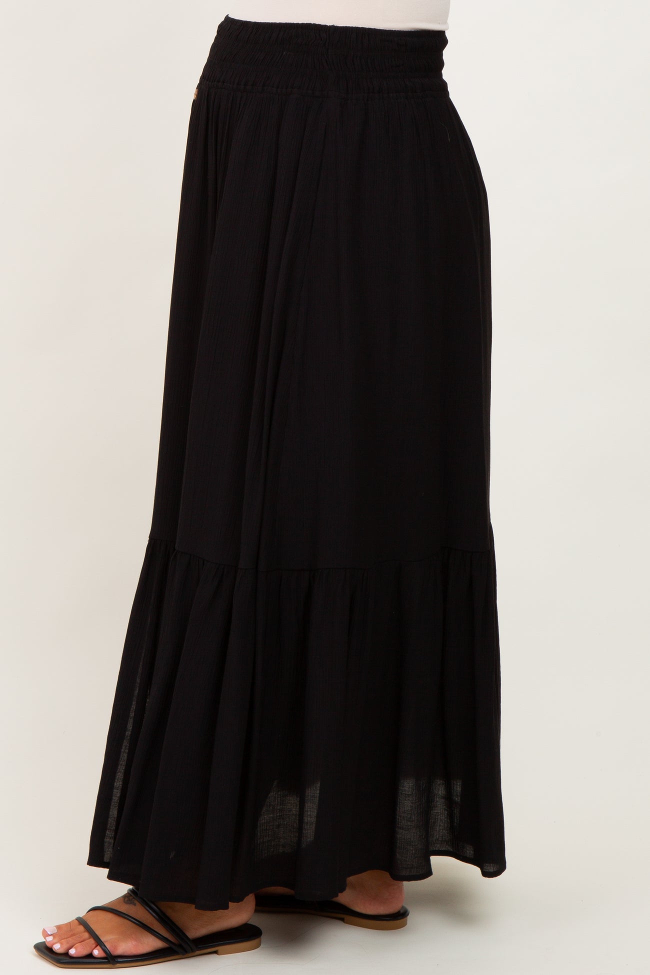 Black Smocked Waist Button Accent Maternity Maxi Skirt