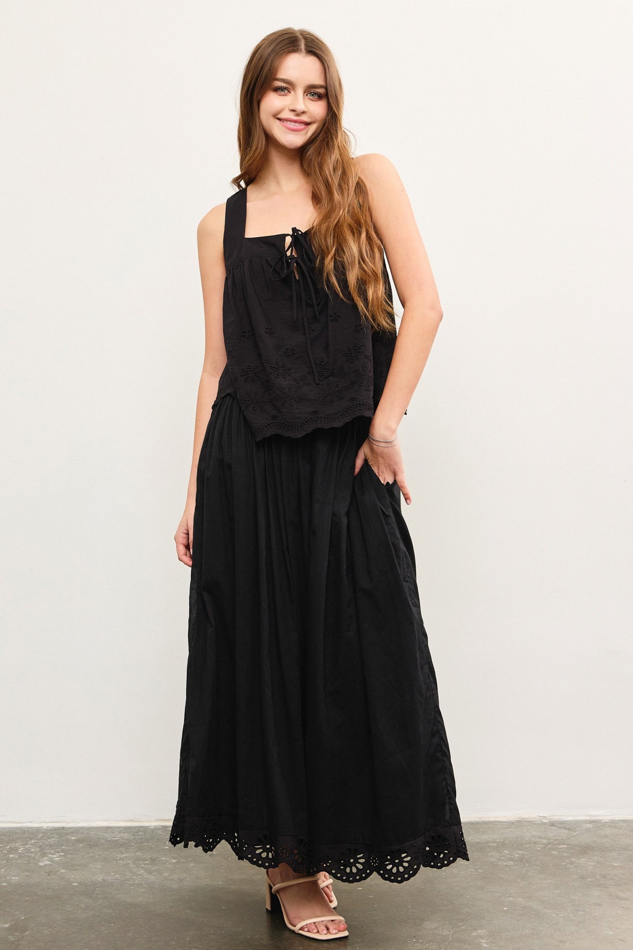 Black Smocked Waist Eyelet Lace Hem Maternity Maxi Skirt