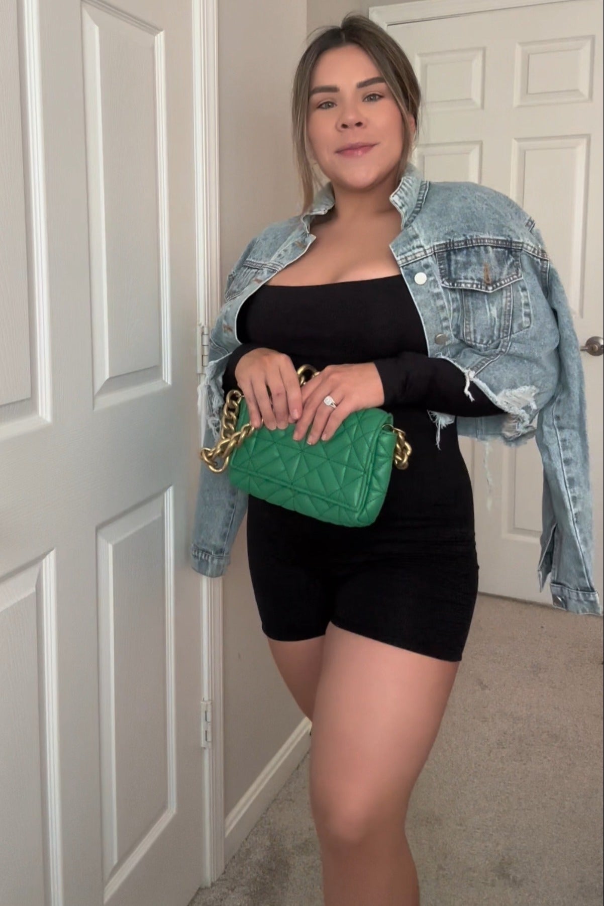 Details A solid, stretch knit maternity romper featuring a squared neckline and long sleeves. Content + Care