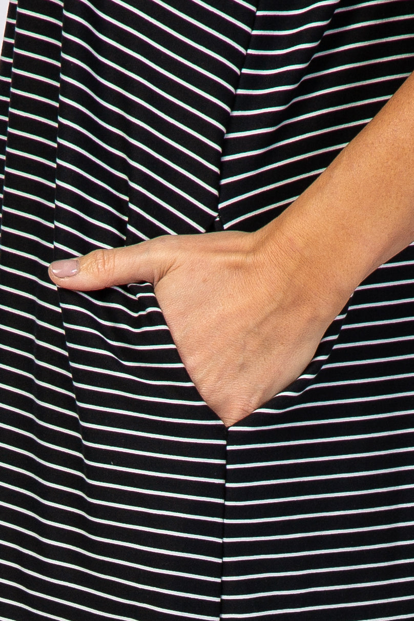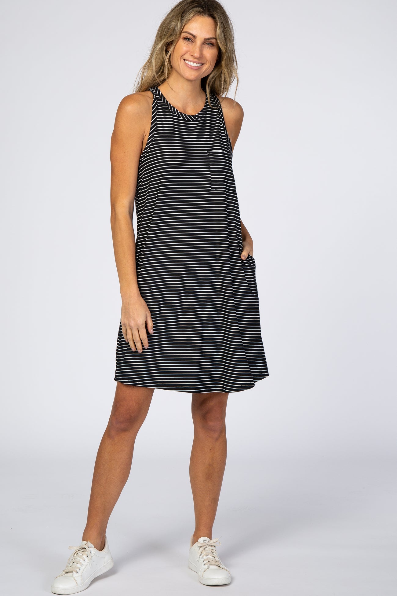 Details A sleeveless striped swing dress featuring a front pocket, side pockets and a rounded neckline. Content + Care