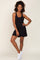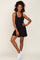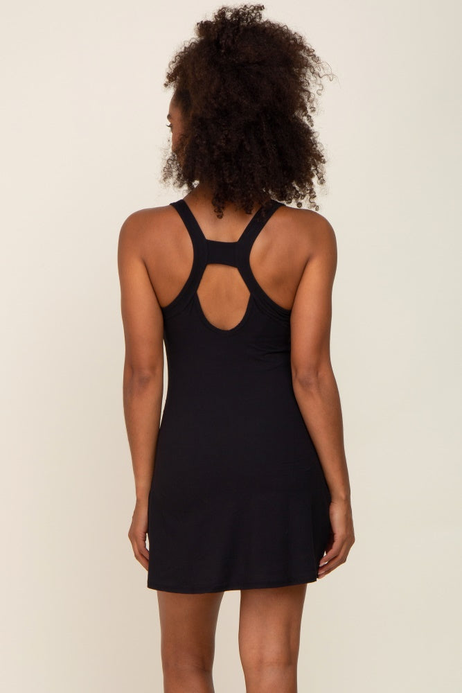 A soft knit tennis romper dress. Features a scoop neckline, a racerback with a cutout, removable cups, an elastic band under the bust, and side pockets on the shorts.