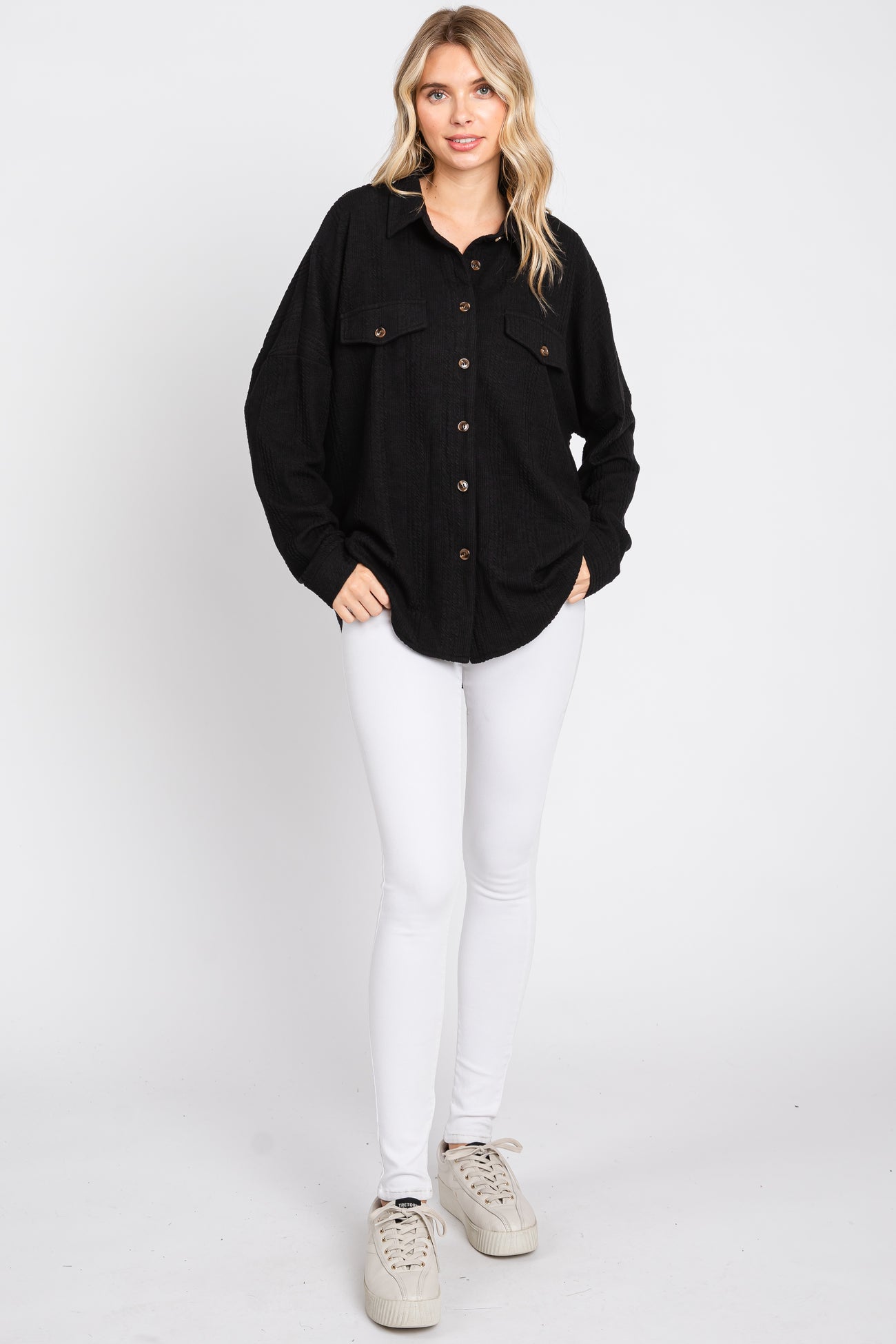 A textured top featuring long sleeves, a button down front, pocket accents and a collared neckline.