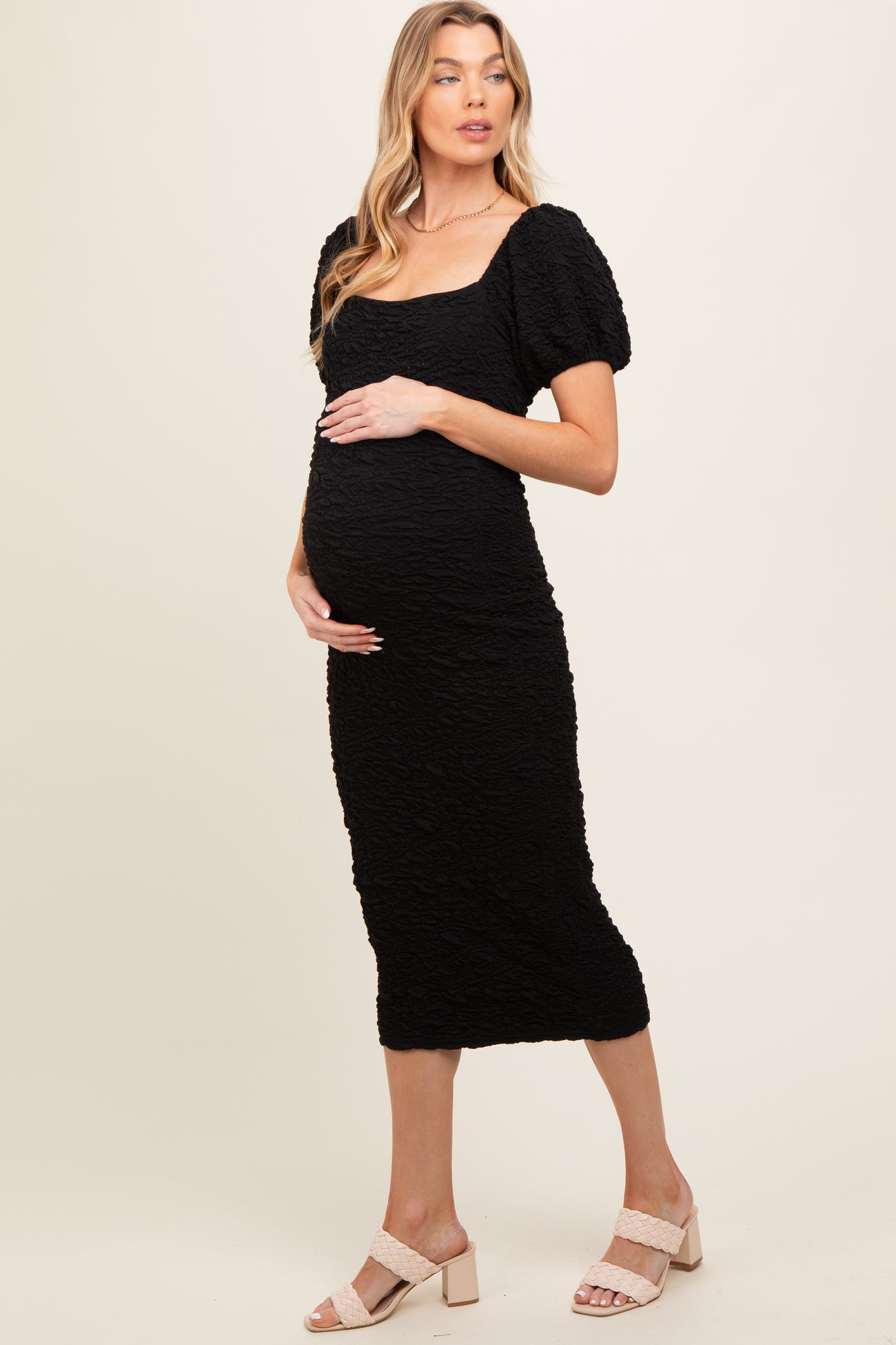 Black Textured Square Neck Puff Sleeve Maternity Midi Dress
