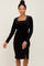 A solid, velvet dress with long sleeves, a squared neckline, and a side slit.
