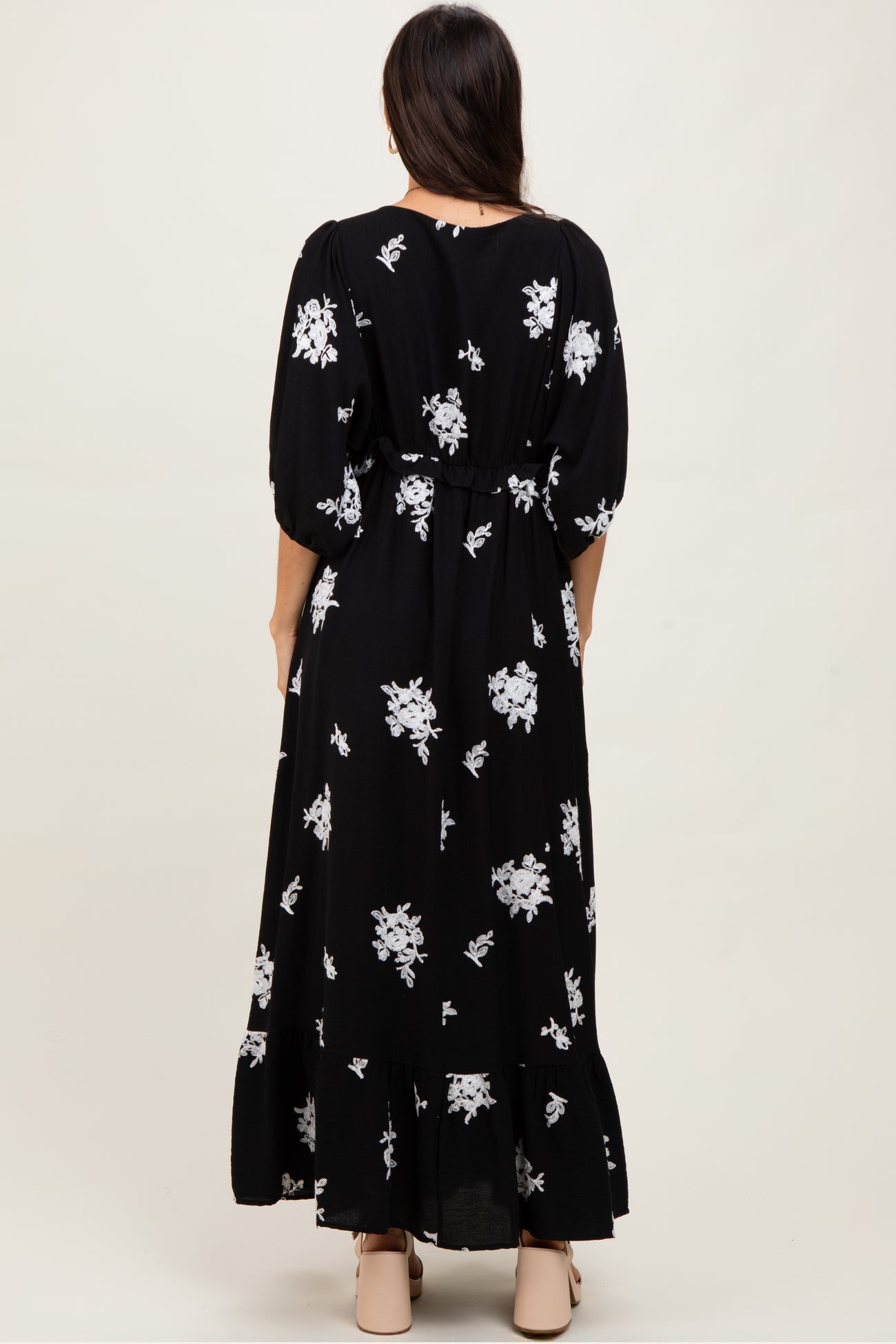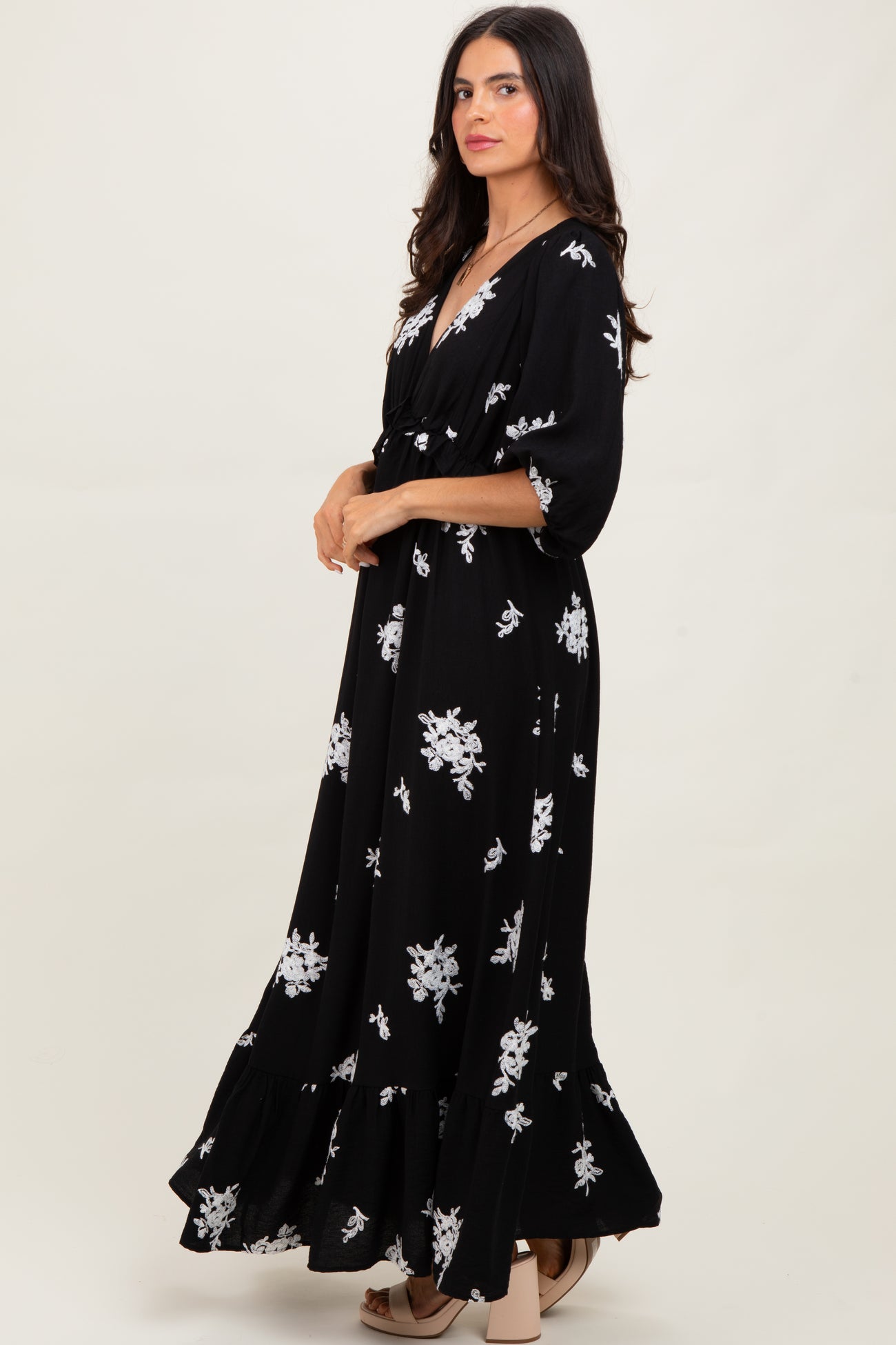 Elevate your wardrobe with this Black Vintage Floral Embroidered V-Neck Maxi Dress. Featuring delicate white floral embroidery on a flowing black fabric, this dress exudes timeless elegance. The flattering V-neckline and 3/4 sleeves add a touch of sophistication, while the empire waist enhances your silhouette. Perfect for garden parties, casual outings, or special occasions, its maxi length and soft ruffled hem create graceful movement with every step. Pair with sandals or heels for an effortlessly chic look that blends vintage charm with modern style. Embrace comfort and class in one stunning dress.