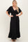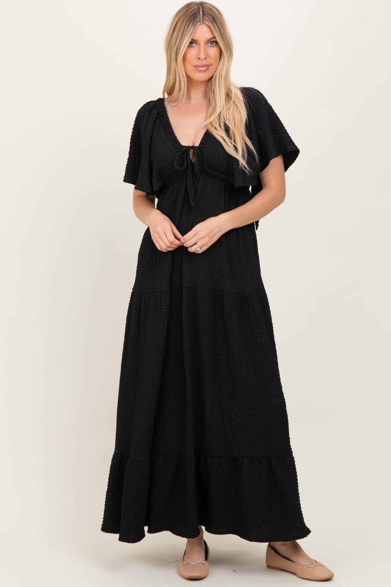 Black Woven Textured Flutter Sleeve V-Neck Tiered Maxi Dress