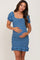 A solid chambray maternity mini fitted dress. Features puff sleeves, tie front detail, smocked body, and ruffle accent hem.