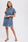A denim mini dress with a collar, front functioning buttons, a front pocket, cuffed short dolman sleeves, side pockets, and a frayed hem.