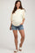 A medium wash pair of maternity jean shorts with light distressing, fringe hem, five pockets and full panel elastic bellyband. Material has high stretch.