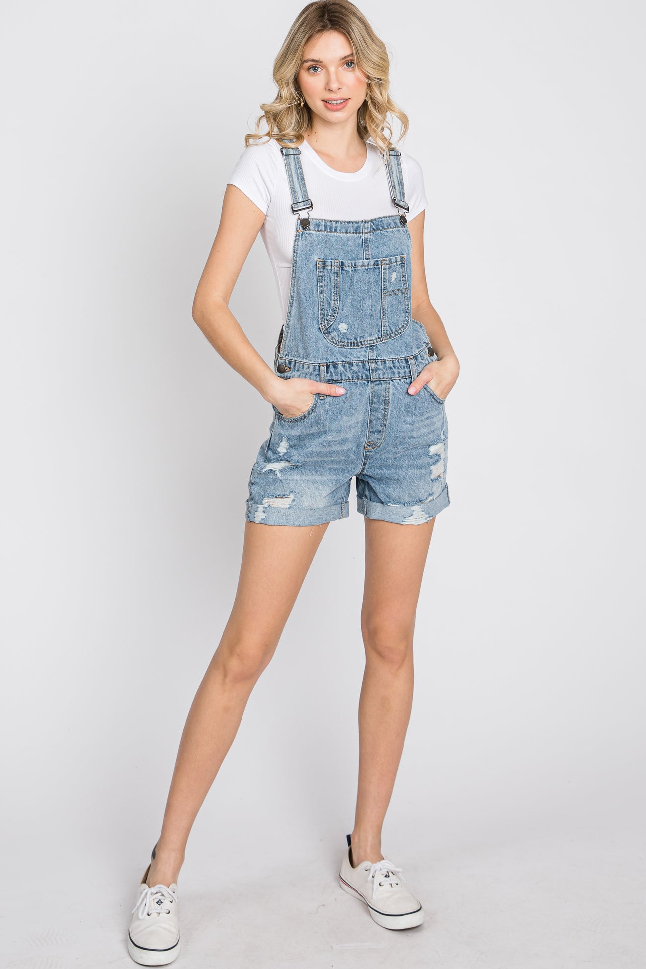 Details Denim distressed overalls with adjustable straps and front, back, and side pockets. Also features side button closures and a cuffed hem. Content + Care