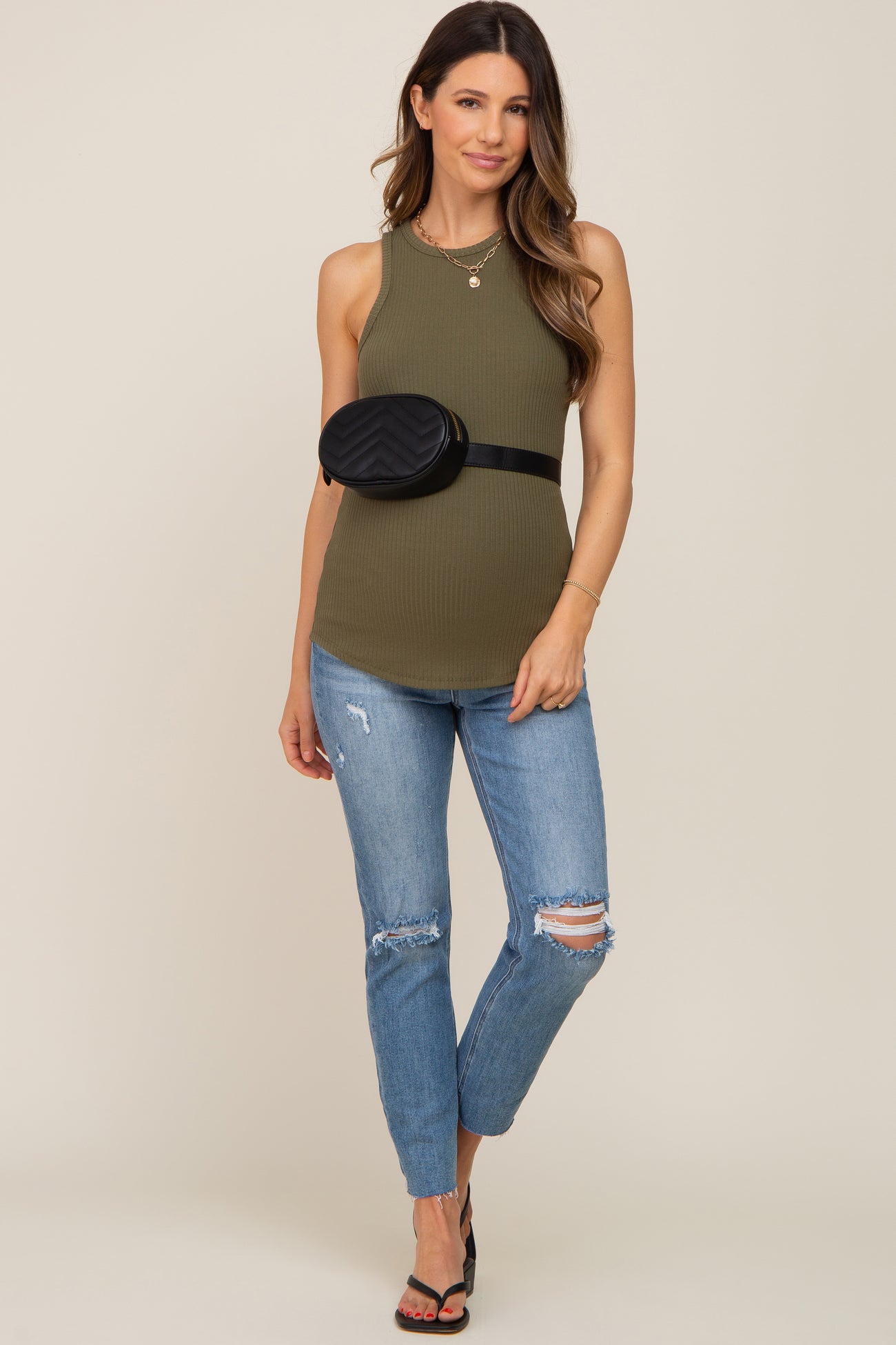 A pair of maternity jeans with five pockets, distressed details, a raw hem on ankles and full panel elastic belly band. Material has high stretch.
