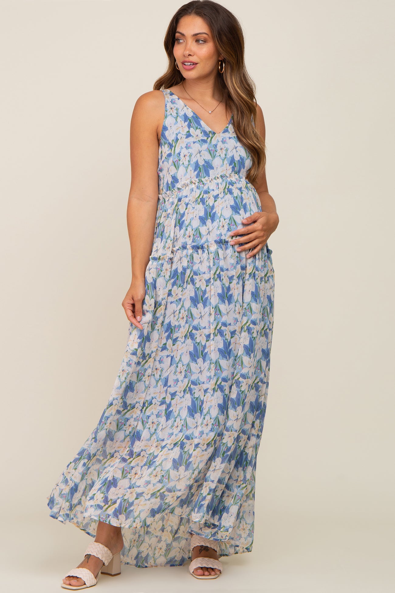 Blue Floral Chiffon Sleeveless Maternity Maxi Dress