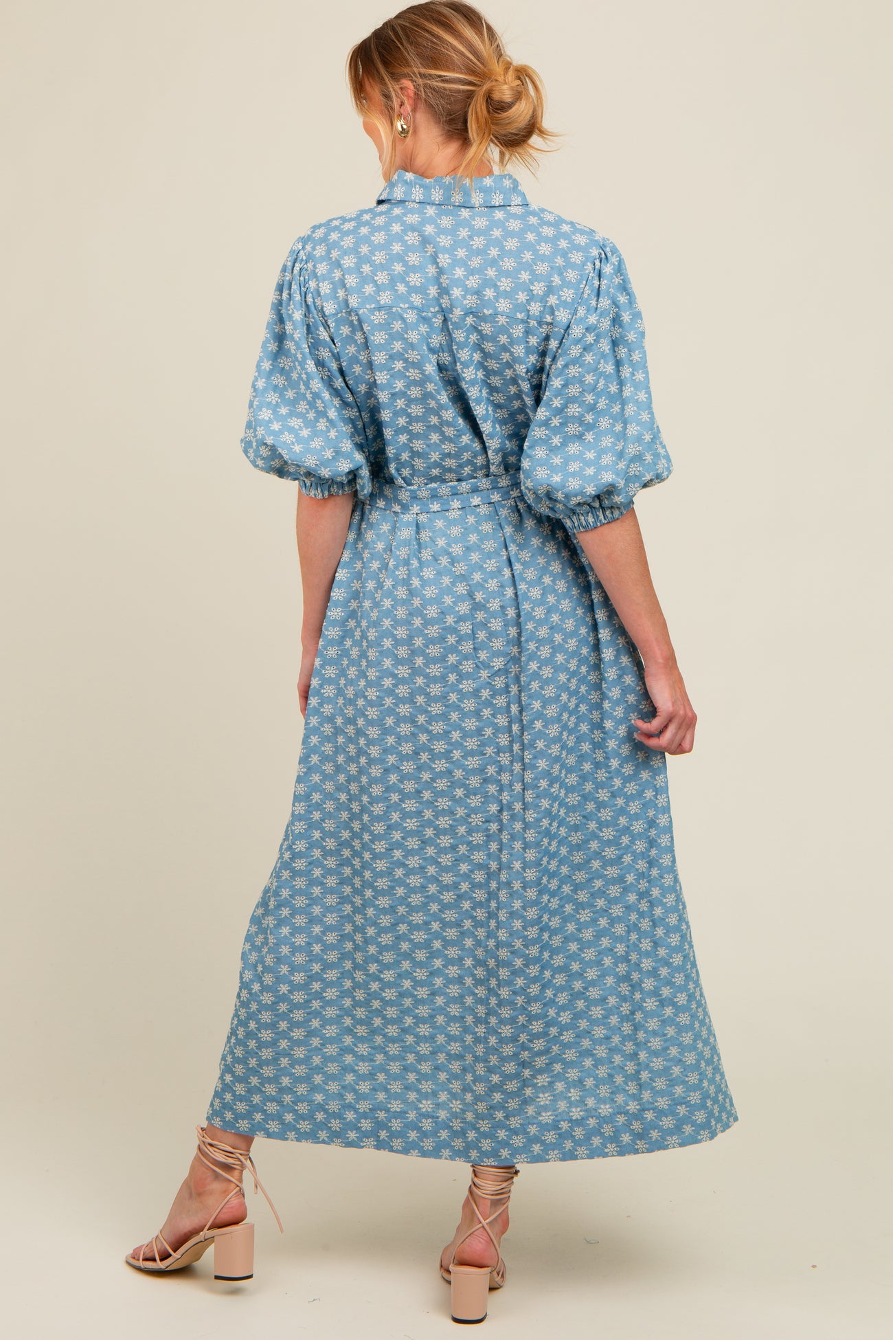 Blue Floral Embroidered Button Down Chambray Maternity Maxi Dress