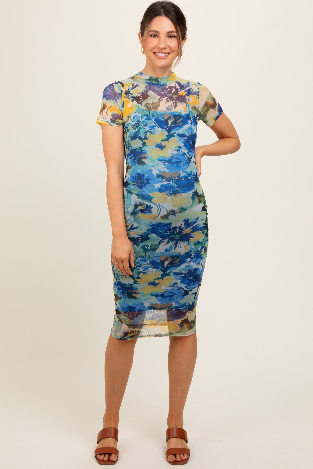Blue Floral Mesh Short Sleeve Maternity Midi Dress