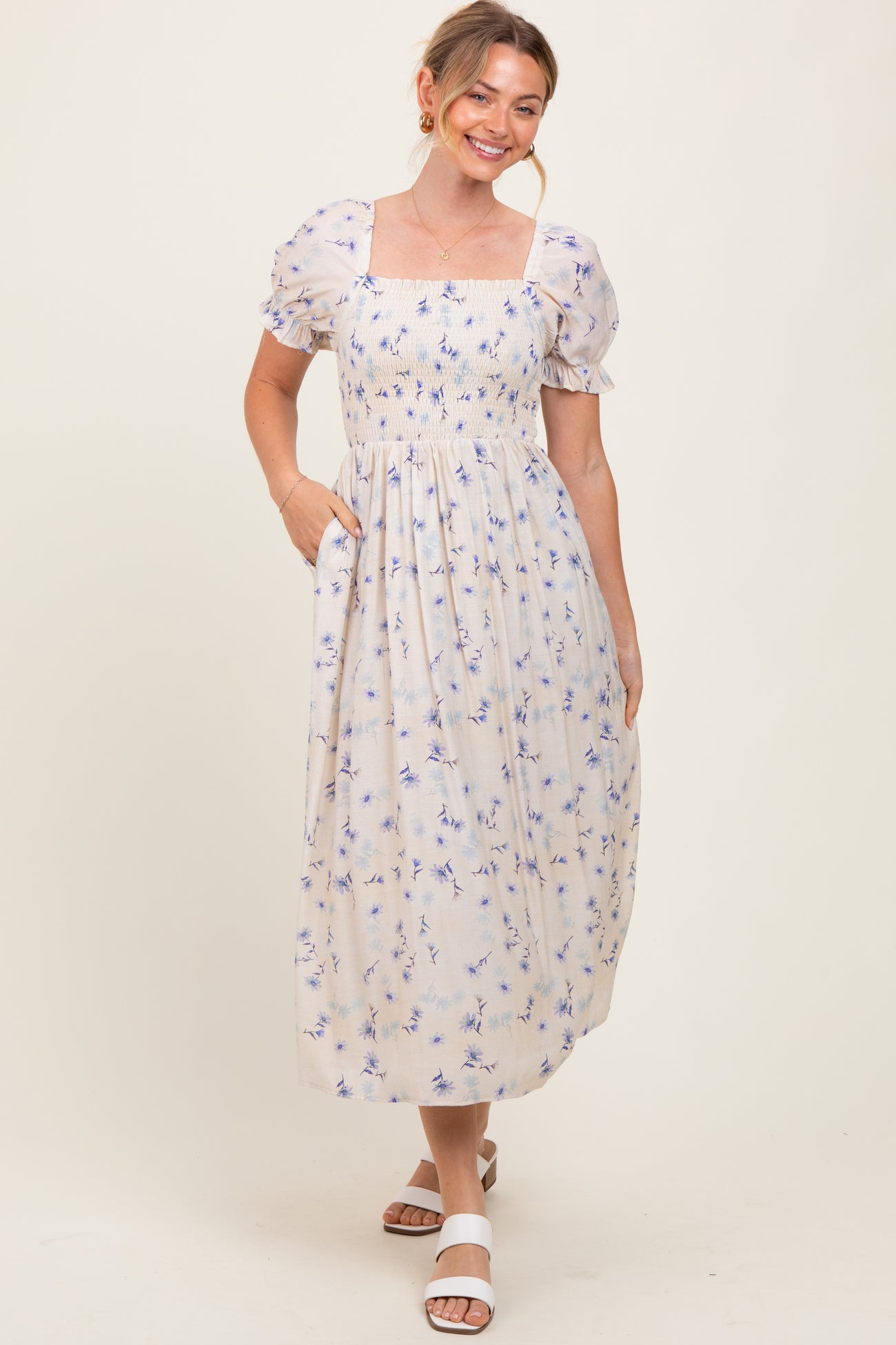 Blue Floral Printed Puff Sleeve Maternity Midi Dress