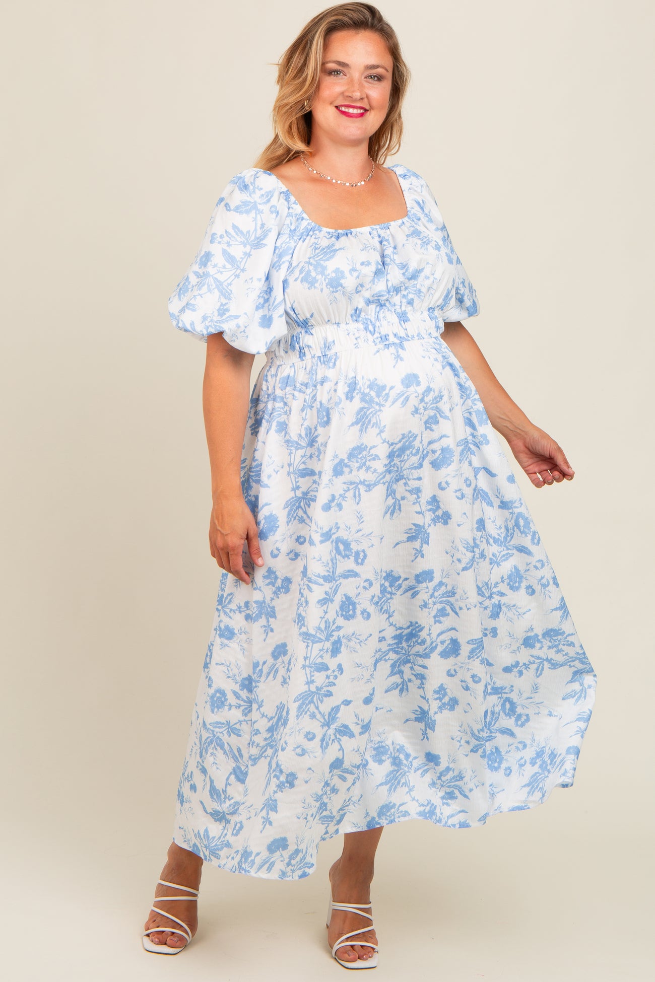 Blue Floral Puff Sleeve Maternity Plus Midi Dress