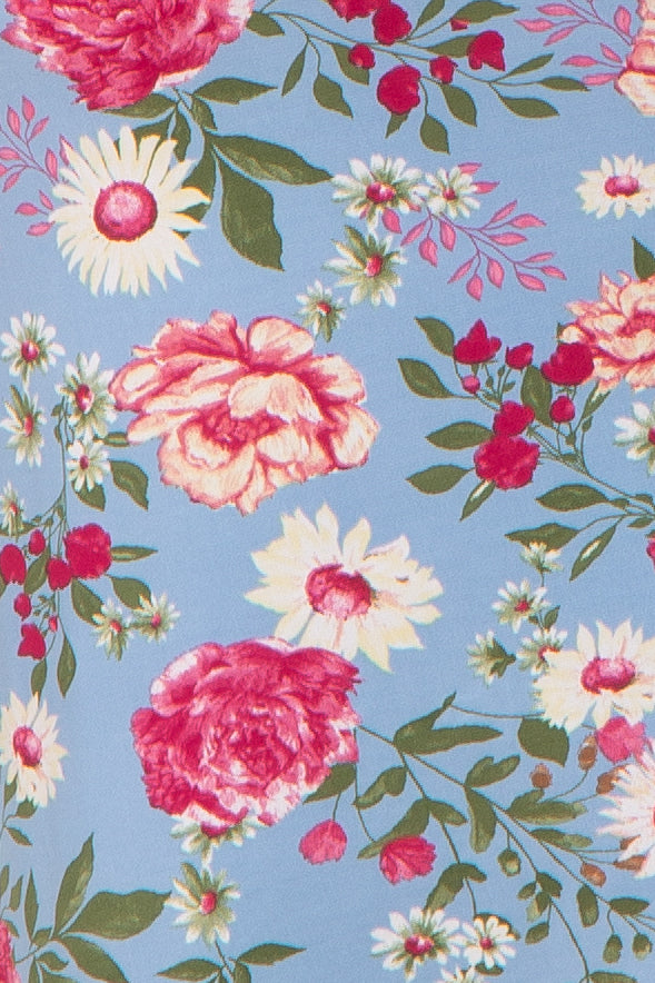A floral maternity plus size midi dress with a rounded neckline, a ruched side, and an asymmetrical hem. Dress is lined.