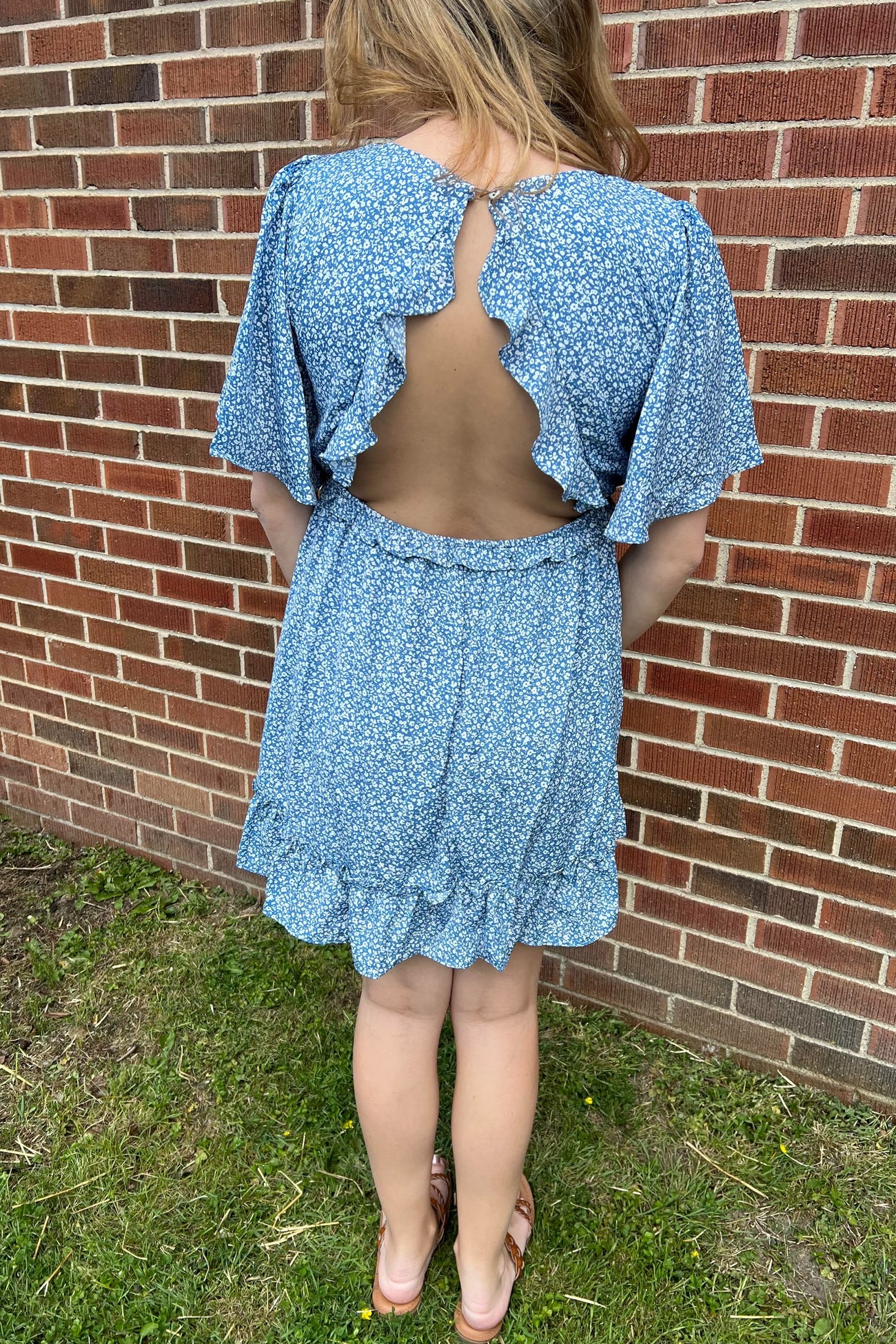 Details A floral dress with a deep v-neckline, short flounce sleeves, a back button closure, an elastic waistline, and a back cutout. Ruffles featured under the bust, on the bottom hem, and along the back cutout. Dress is lined to prevent sheerness. Content + Care