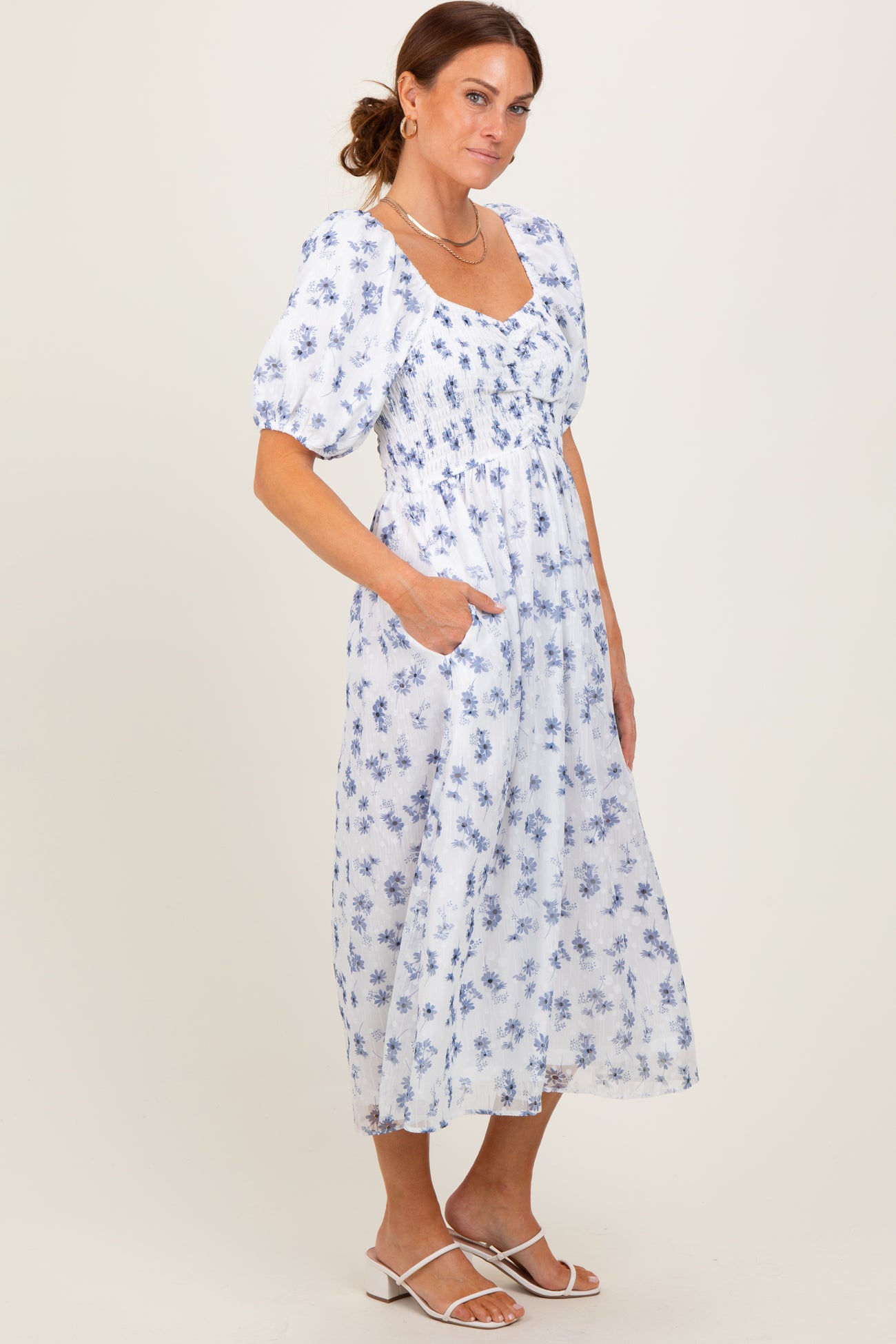Blue Floral Smocked Bodice Midi Dress