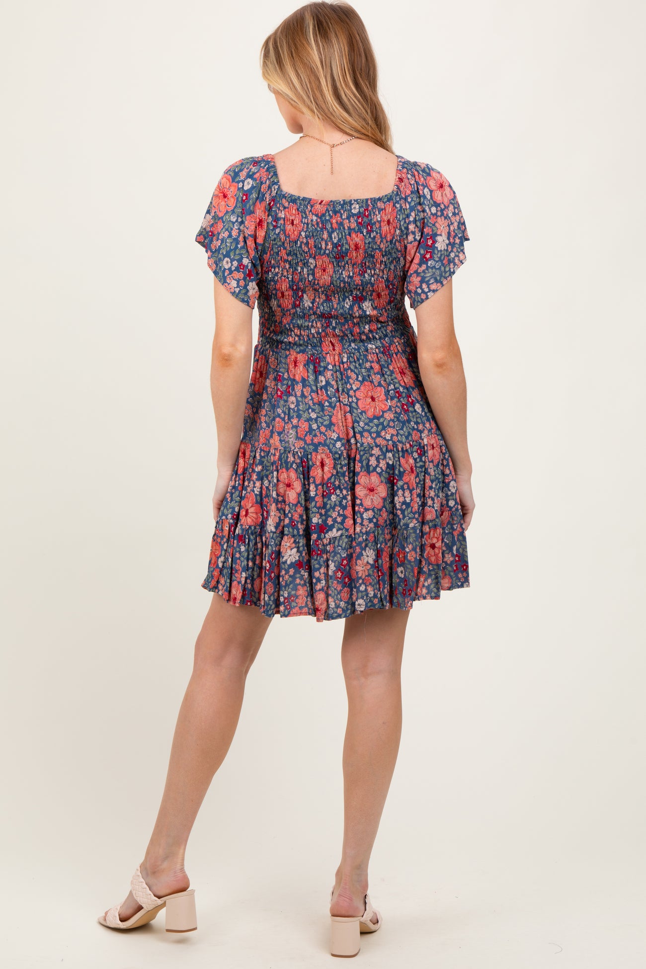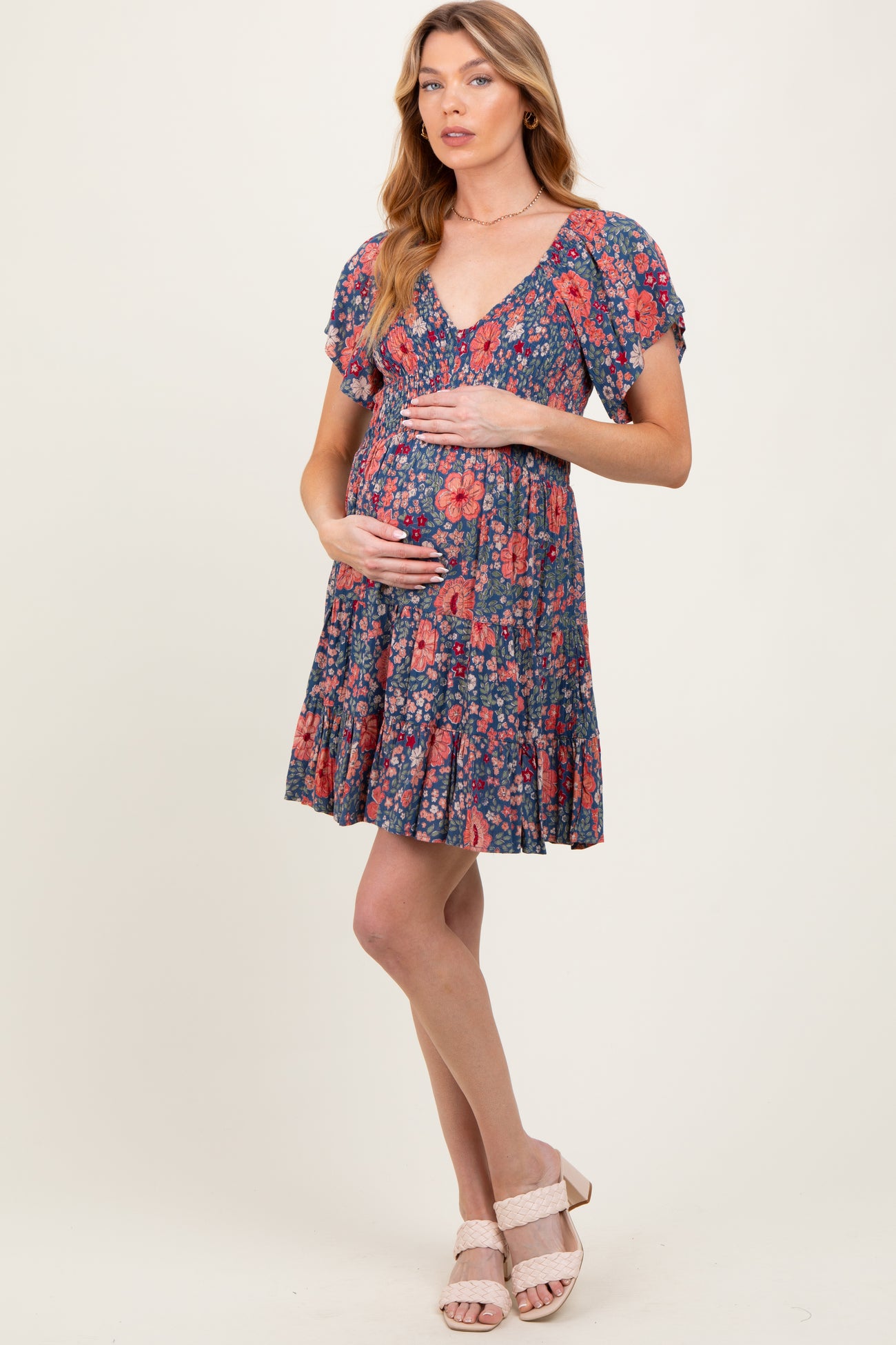 Blue Floral Smocked V-Neck Flutter Sleeve Maternity Dress
