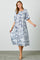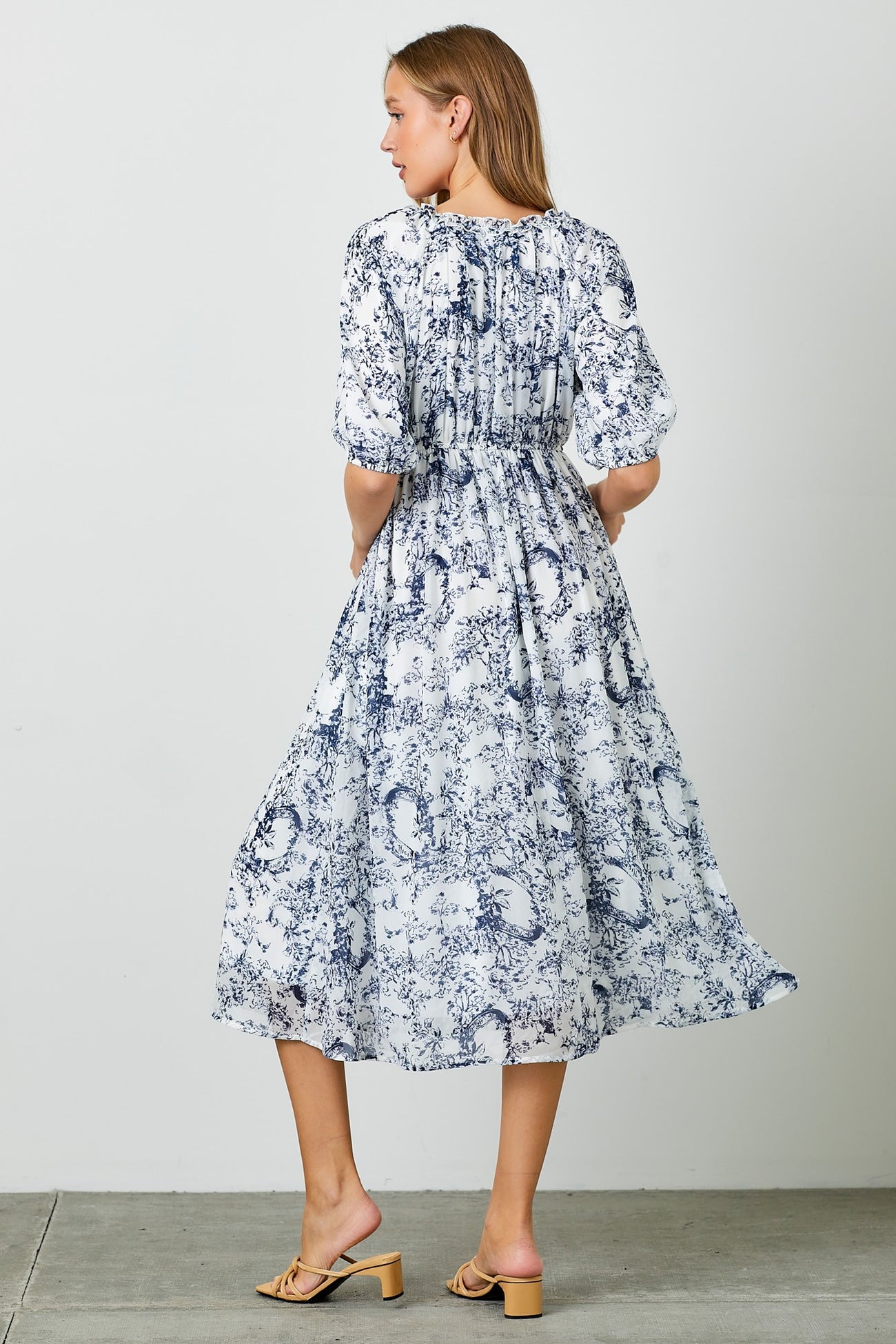 Blue Floral Square Neck Short Puff Sleeve Midi Dress