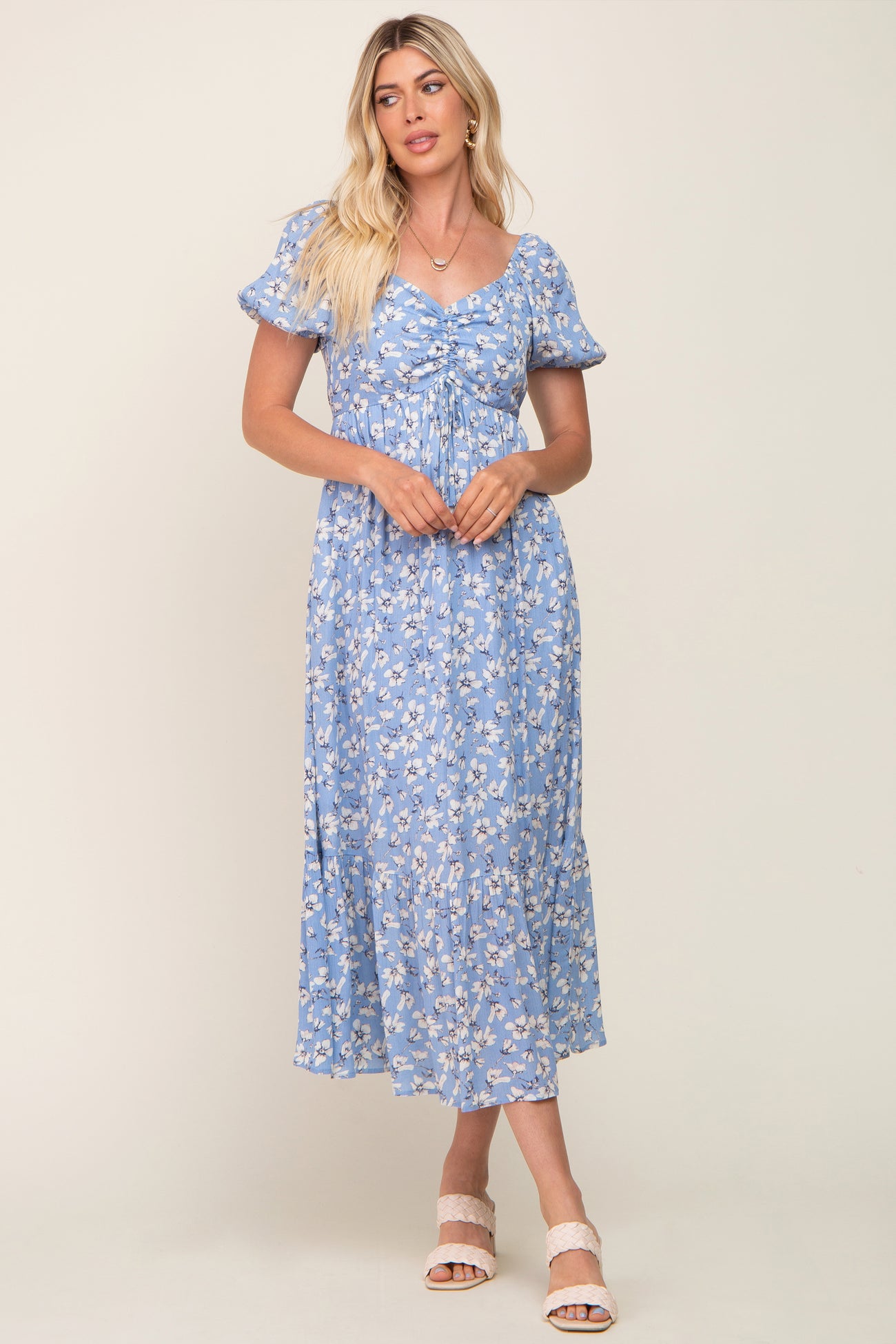 Blue Floral Sweetheart Drawstring Neck Short Sleeve Midi Dress