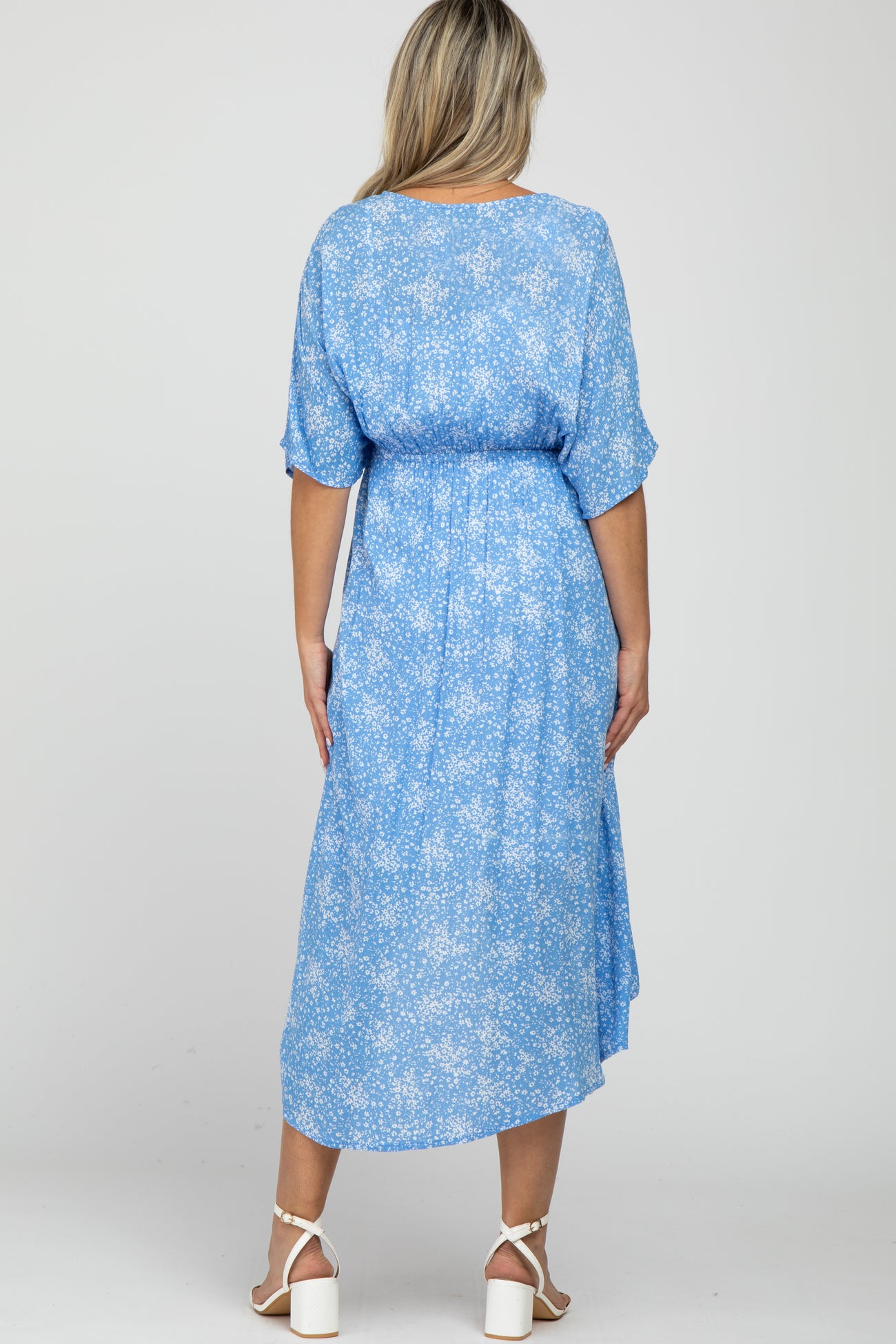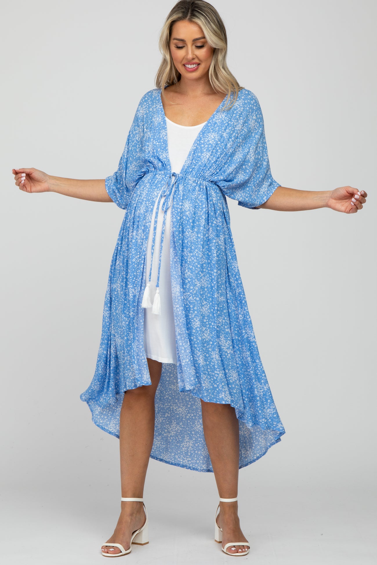 A floral print maternity cover up featuring short sleeves, an adjustable tie with tassel trim, and a hi-low hem.