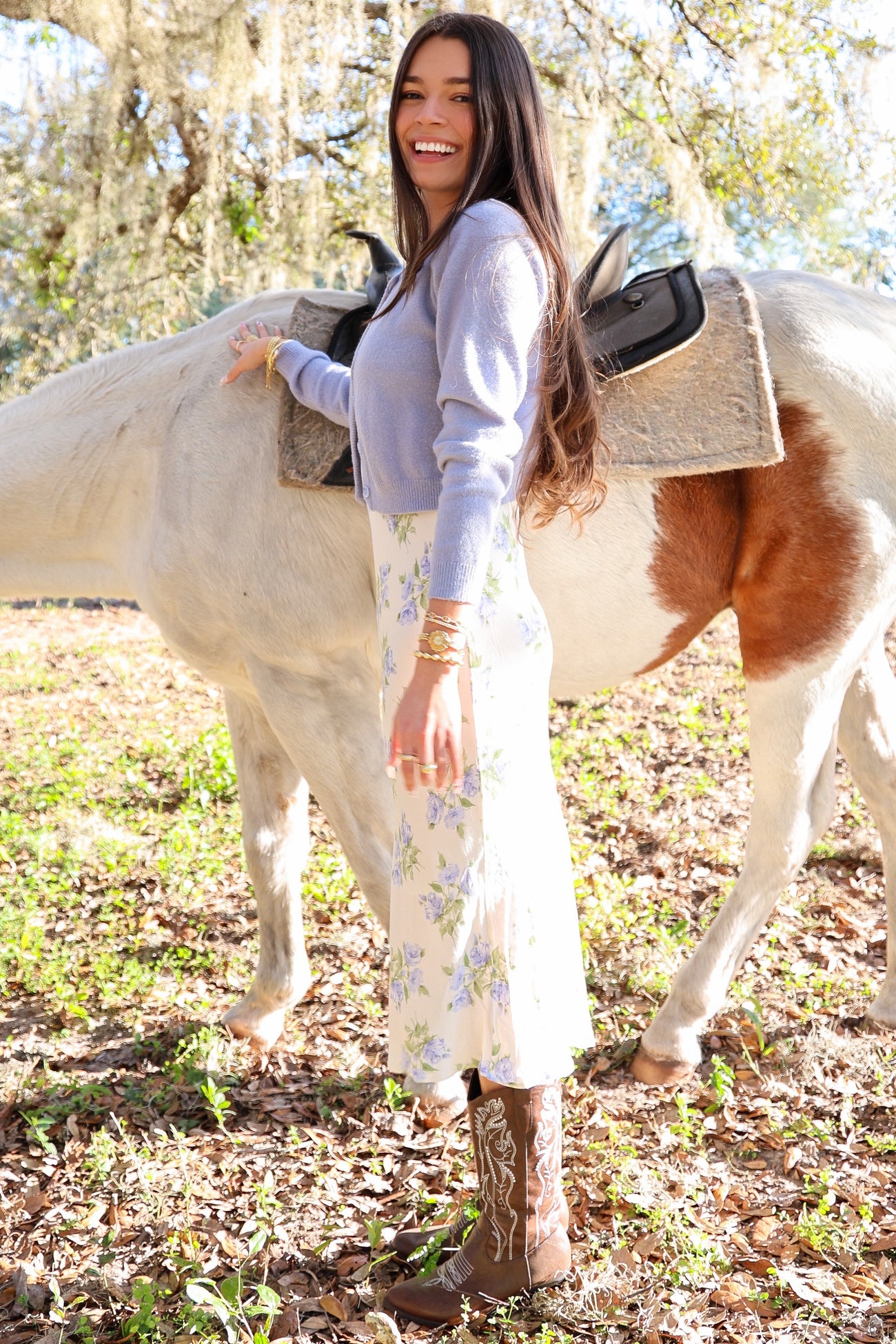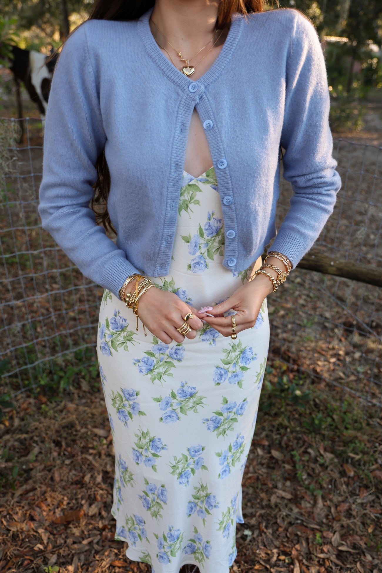 Blue Ivory Floral Sweetheart Neck Long Midi Dress