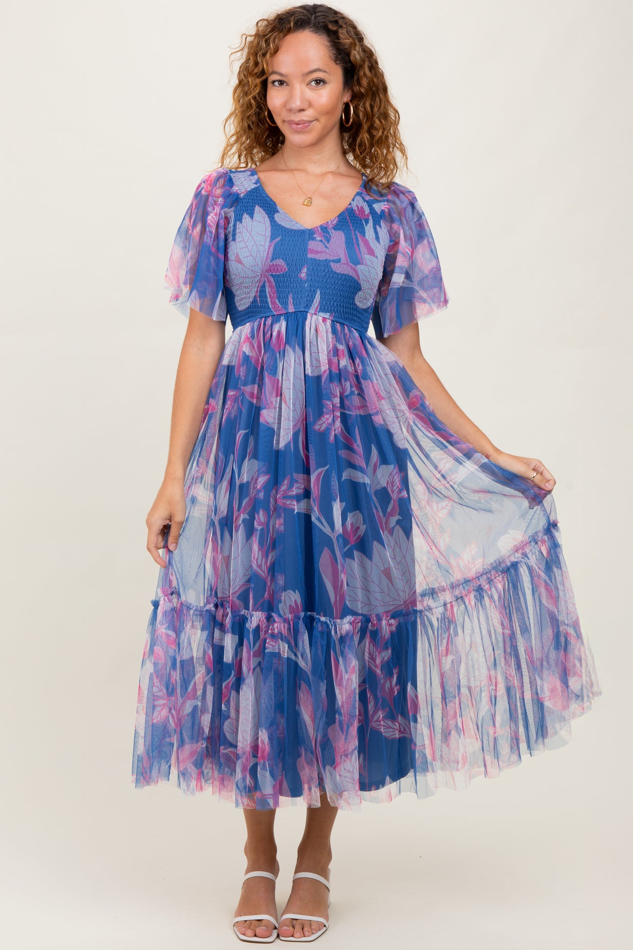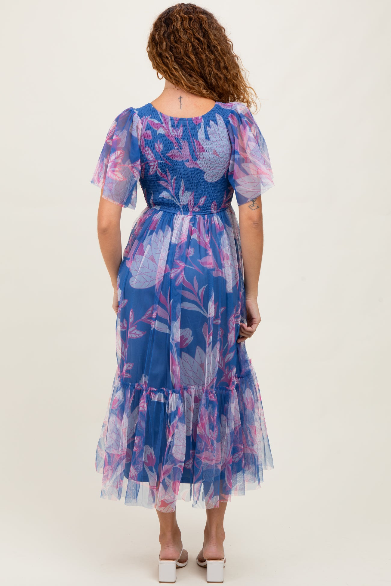 Blue Leaf Print Mesh Smocked Midi Dress