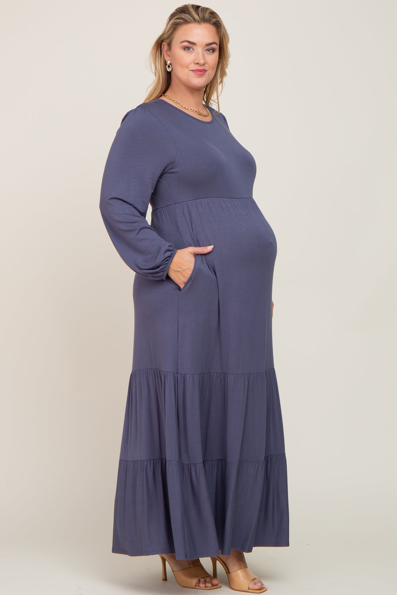 Details A solid hue maternity plus size maxi dress featuring long balloon sleeves, a rounded neckline, side pockets, and a tiered skirt. Content + Care