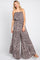 A paisley print jumpsuit featuring a strapless neckline with a ruffle overlay, a smocked elastic top and a ruffle hem.