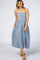 A multicolored striped midi dress. Features button front detail and ruffle neckline. Includes thin adjustable straps, smocked back, two side pockets and a lined skirt.