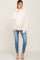 A pair of maternity skinny jeans featuring slightly distressed details, five pockets and an elastic bellyband.
