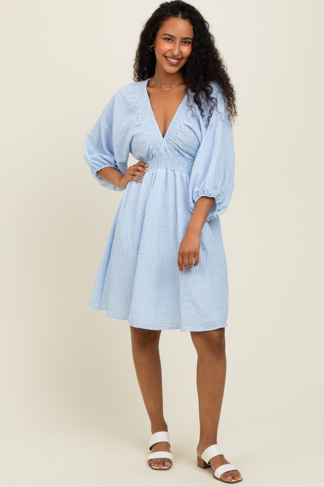 Blue Striped Balloon Sleeve V-Neck Maternity Dress