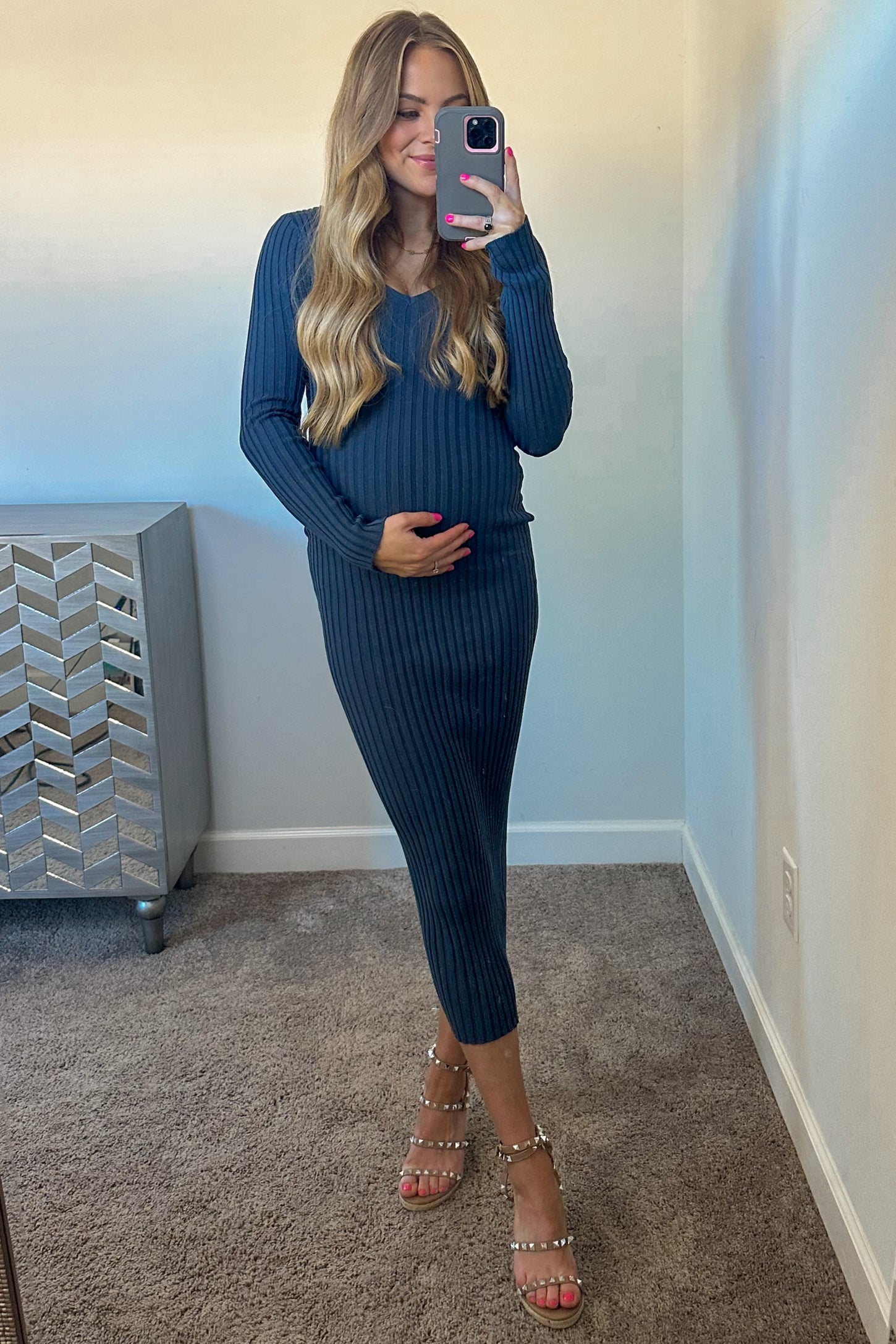 Elevate your maternity wardrobe with our V-Neck Long Sleeve Fitted Maxi Dress. Designed for comfort and style, this dress features a flattering V-neckline, long sleeves, and a beautifully fitted silhouette that highlights your growing bump. The soft, stretchy fabric provides all-day comfort and flexibility, perfect for special occasions or everyday elegance. The maxi length ensures a graceful and chic finish. Effortlessly transition from day to night with this versatile maternity must-have!