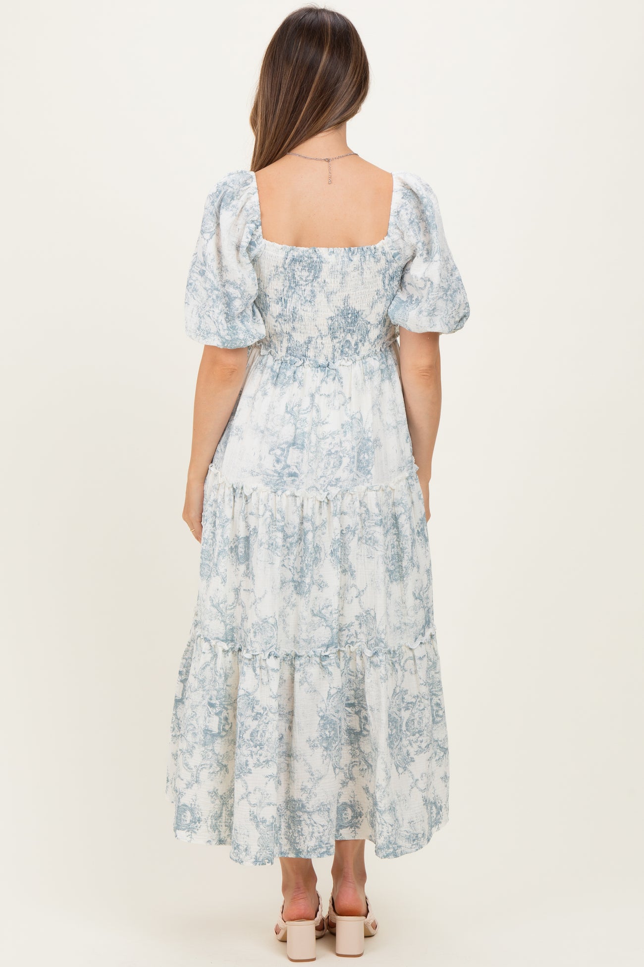 Blue Vintage Floral Puff Sleeve Tiered Maternity Maxi Dress
