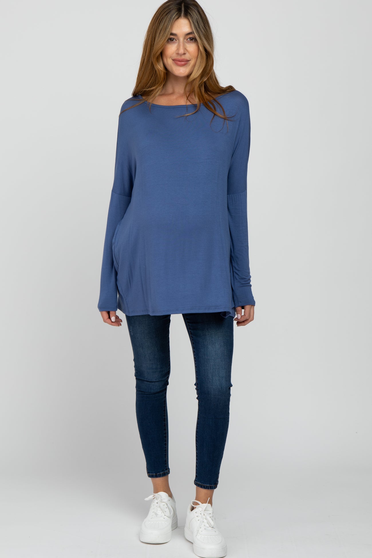 A soft knit maternity top featuring a wide neckline and long fitted sleeves.