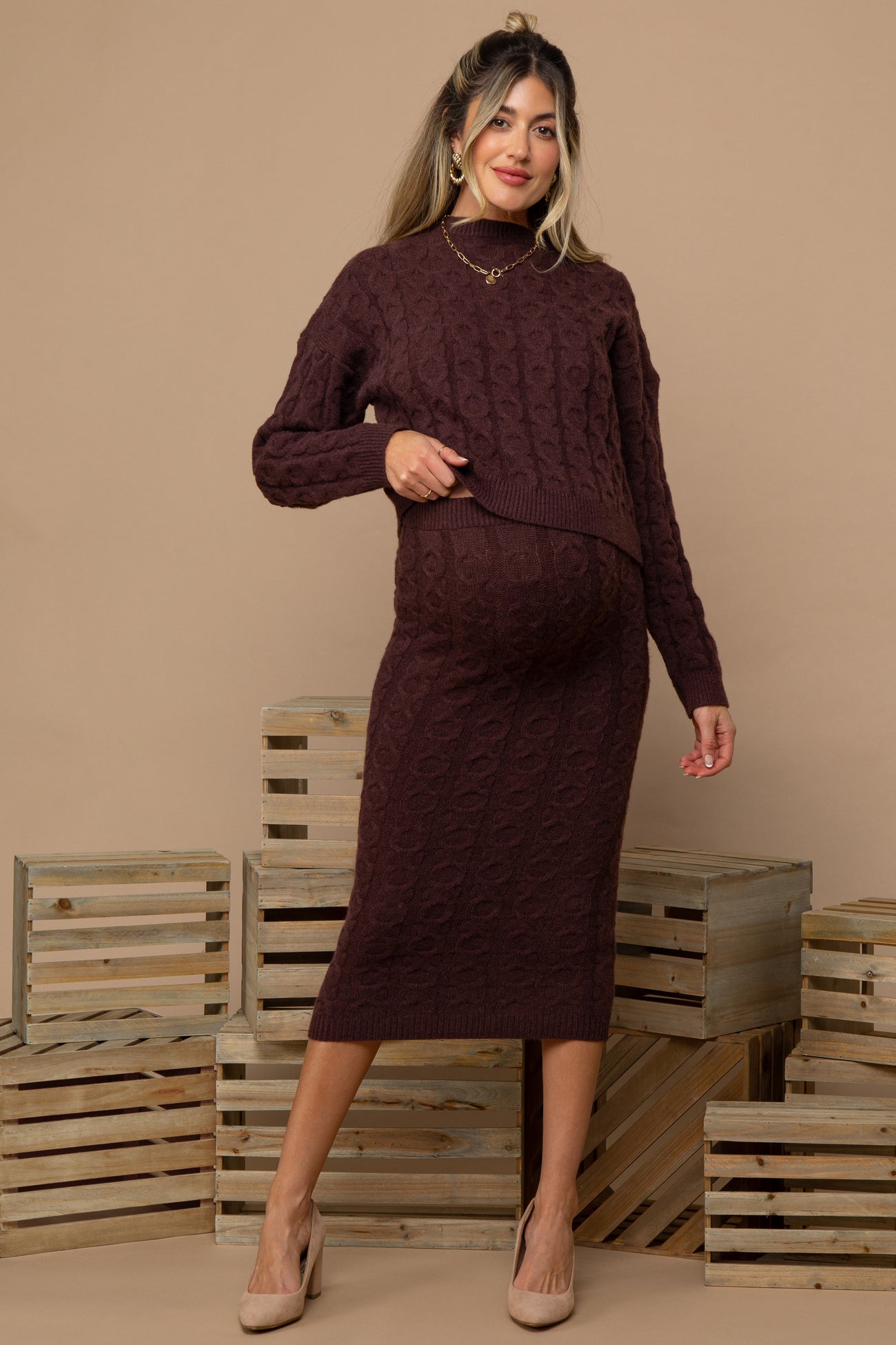 Brown Cable Knit Cropped Sweater Midi Skirt Maternity Set