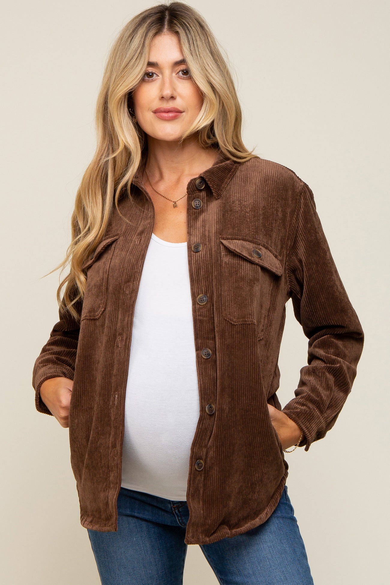 Brown Corduroy Plaid Fleece Lined Button Down Maternity Shacket