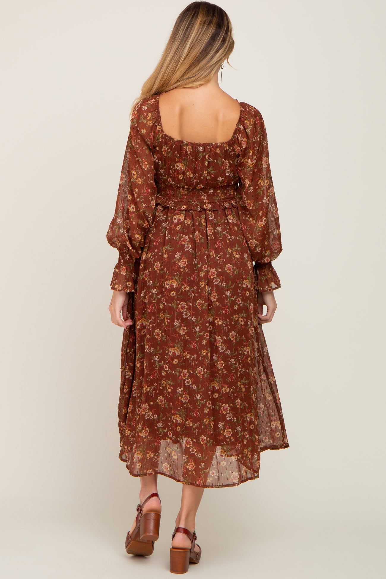 Brown Floral Chiffon Smocked Waist Maternity Midi Dress
