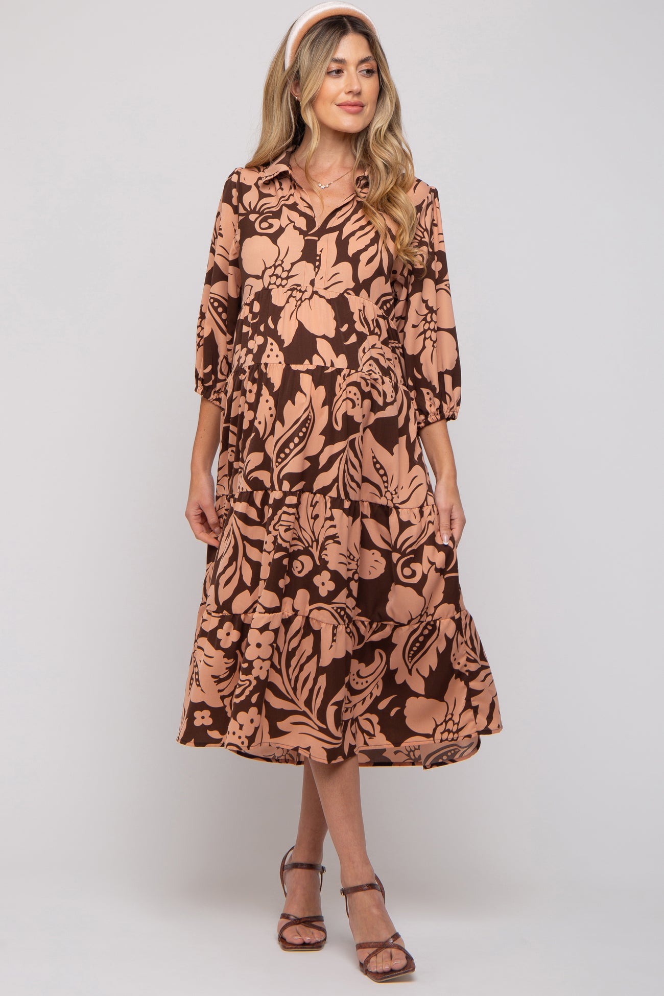 A floral paisley maternity midi dress featuring a collared neckline, 3/4 length puff sleeves and a tiered skirt.