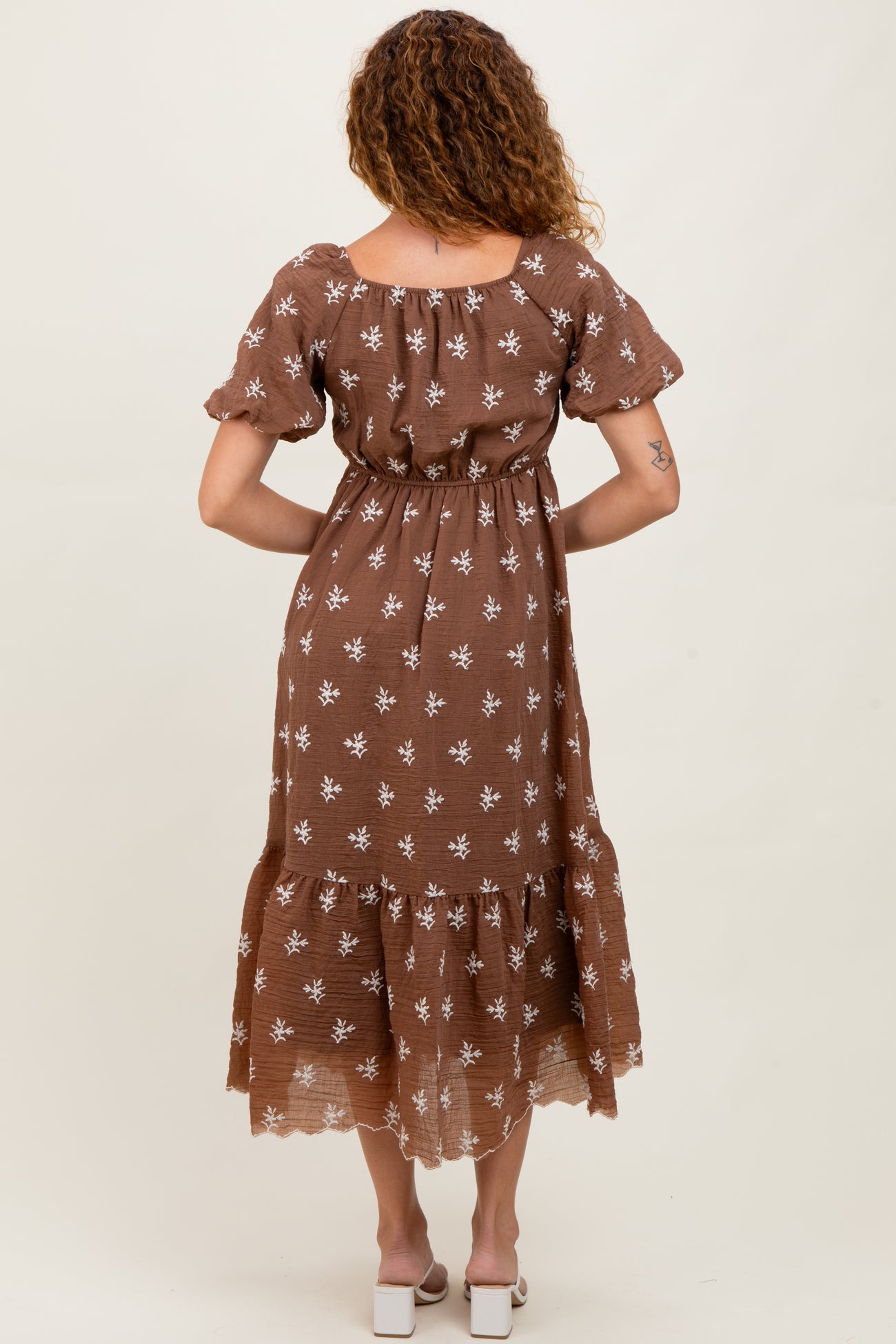 Embrace effortless elegance with our Brown Floral Embroidered Tiered Midi Dress. Crafted from lightweight, breathable fabric, this dress features delicate white floral embroidery on a rich brown backdrop, adding a touch of vintage charm. The tiered midi length and puff sleeves create a flattering silhouette perfect for any occasion, from brunch dates to garden parties. Designed with a subtle scoop neckline and a flowy skirt, it offers comfort and style in one beautiful piece. Pair it with sandals or heels to complete your look. Available in multiple sizes.