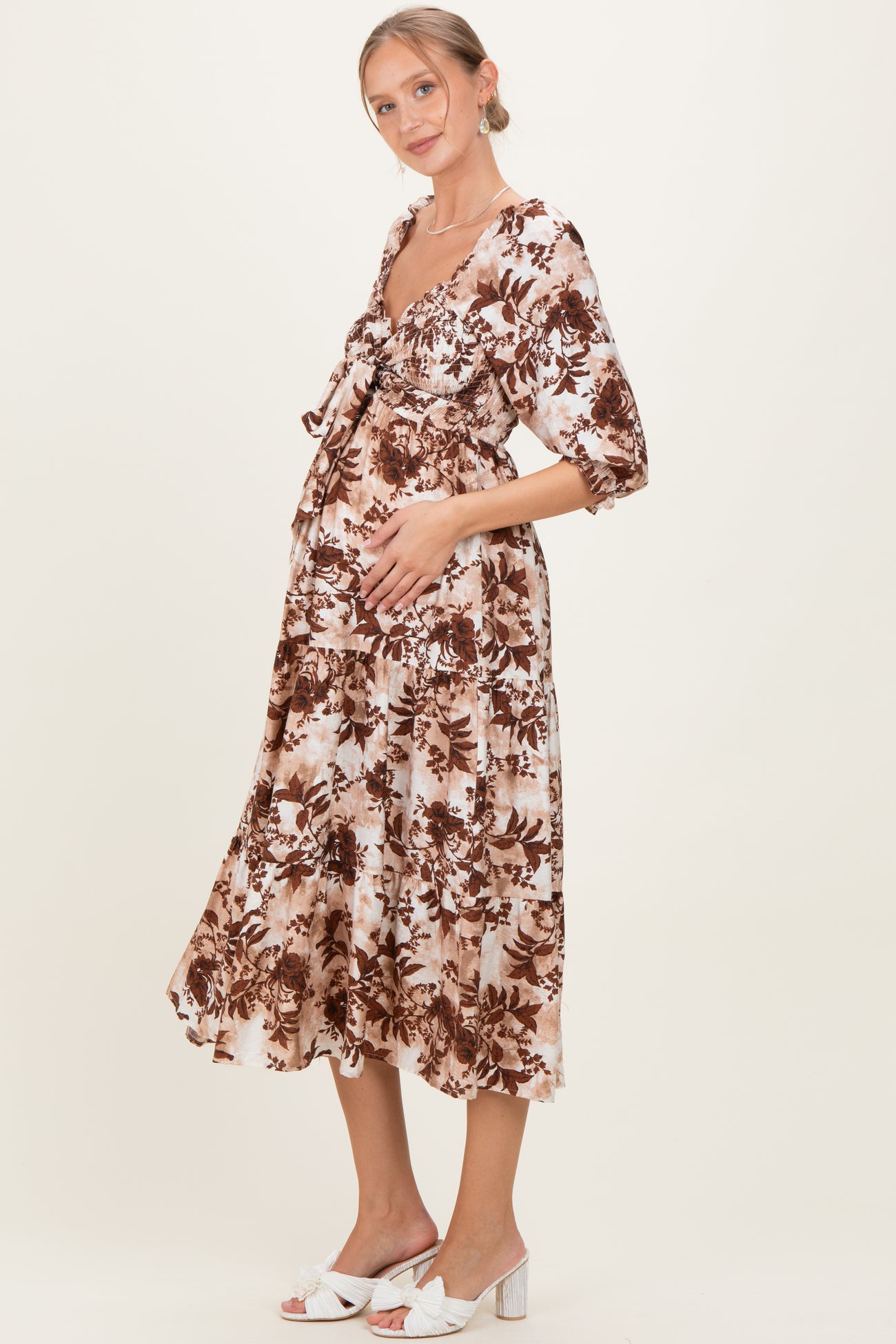 Brown Floral Smocked Front Tie Maternity Maxi Dress
