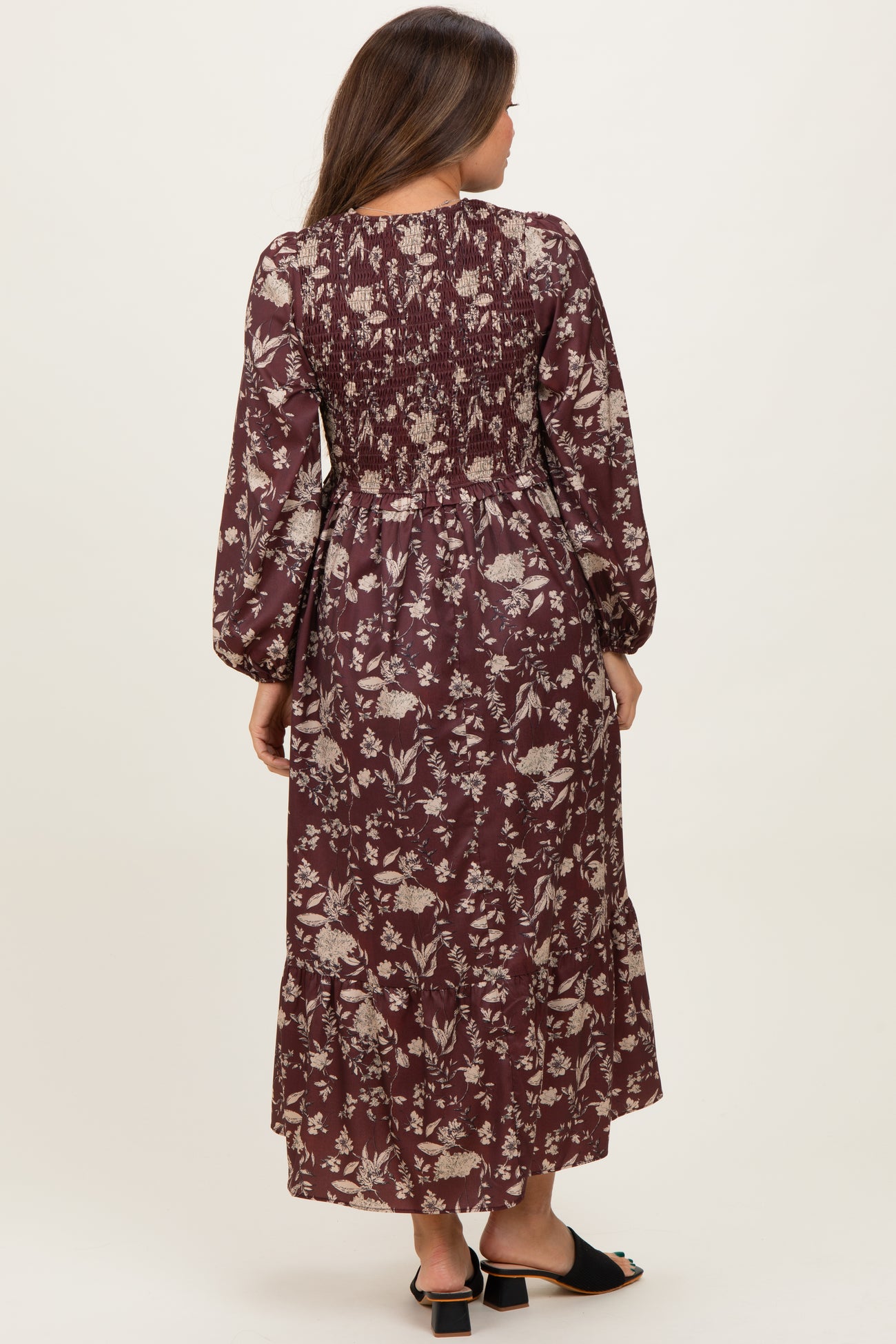 Brown Floral Smocked Long Sleeve Maternity Midi Dress